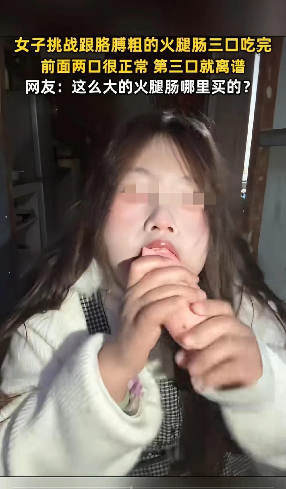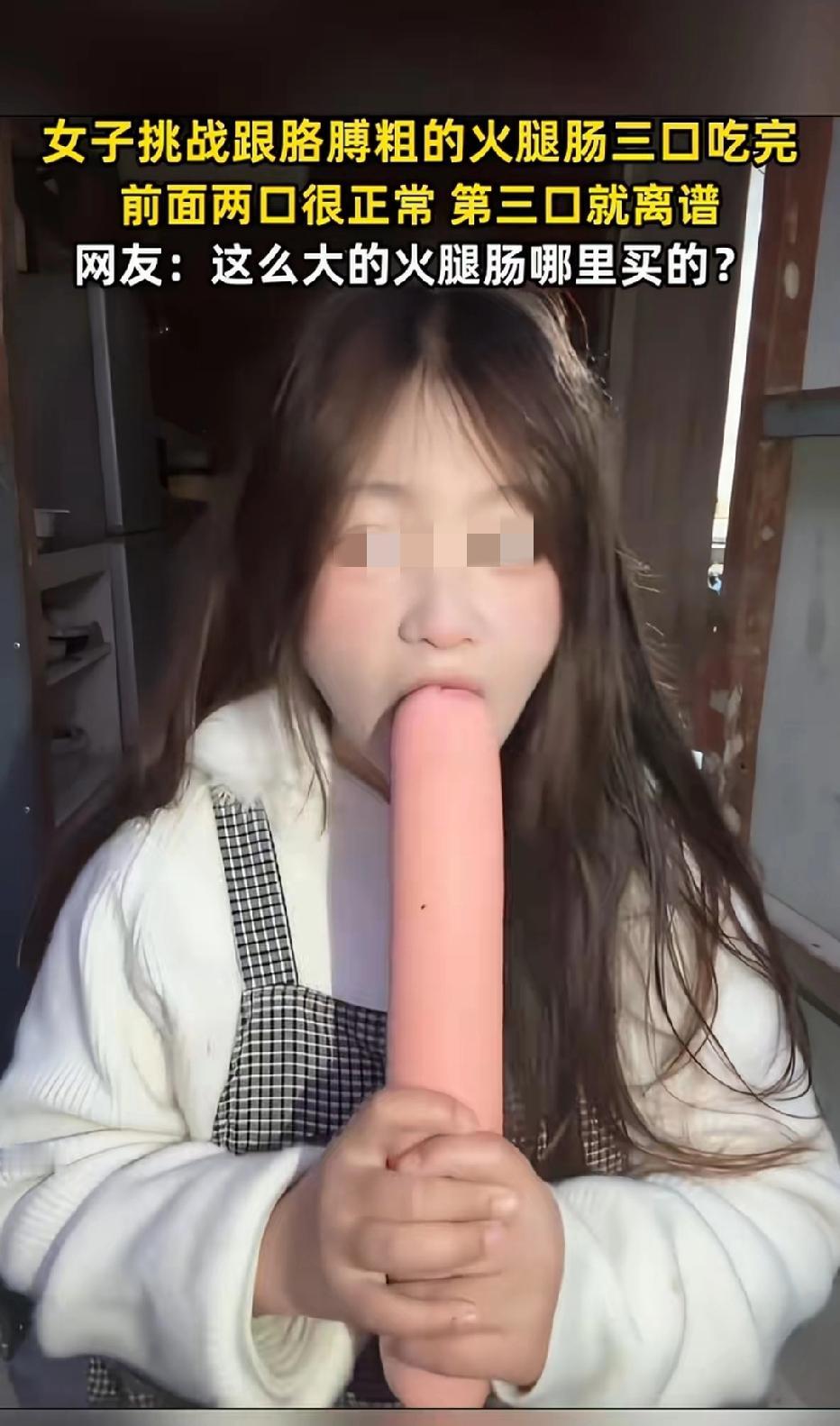 近日江西南昌,一20岁女子说自己减肥,买了根胳膊粗的火腿肠,只吃三口,剩下都丢掉,前面两口都正常,第三口简直离谱! 女子前面两口都是正常吃,谁料,第三口,女子直接一口气不停地将胳膊粗的火腿肠吃了下去,整个嘴巴里塞满了火腿肠,笑嘻嘻的表示,嘿嘿,说好只吃三口的,不能浪费了!