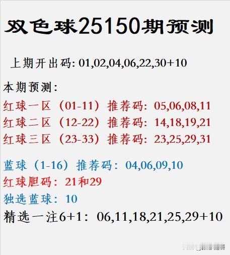 双色球第25150期预测精析 上期回顾: 开出号码为 01、02、04、06、22、30 + 蓝号10,区间分布均衡,冷热号码交错出现,为本期选号提供了参考依据。 本期展望: 红球一区(01—11) 推荐关注:05、06、08、11 该区近期热号频现,可适度追踪温号与回补号的组合。 红球二区(12—22) 推荐关注:14、18、19、21 此段走势稳中有变,18、21有望成为本期的亮点号码。 红球三区(23—33) 推荐关注:23、25、29、31 三区大号热度不减,25与29在形态图上呈强势信号。 蓝球(1—16) 推荐关注:04、06、09、10 其中 10 为本期的独选蓝号,值得重点关注。 核心胆码: 红球双胆:21、29 —— 兼具形态与趋势支持。 精选组合推荐(6+1): 06、11、18、21、25、29 + 10