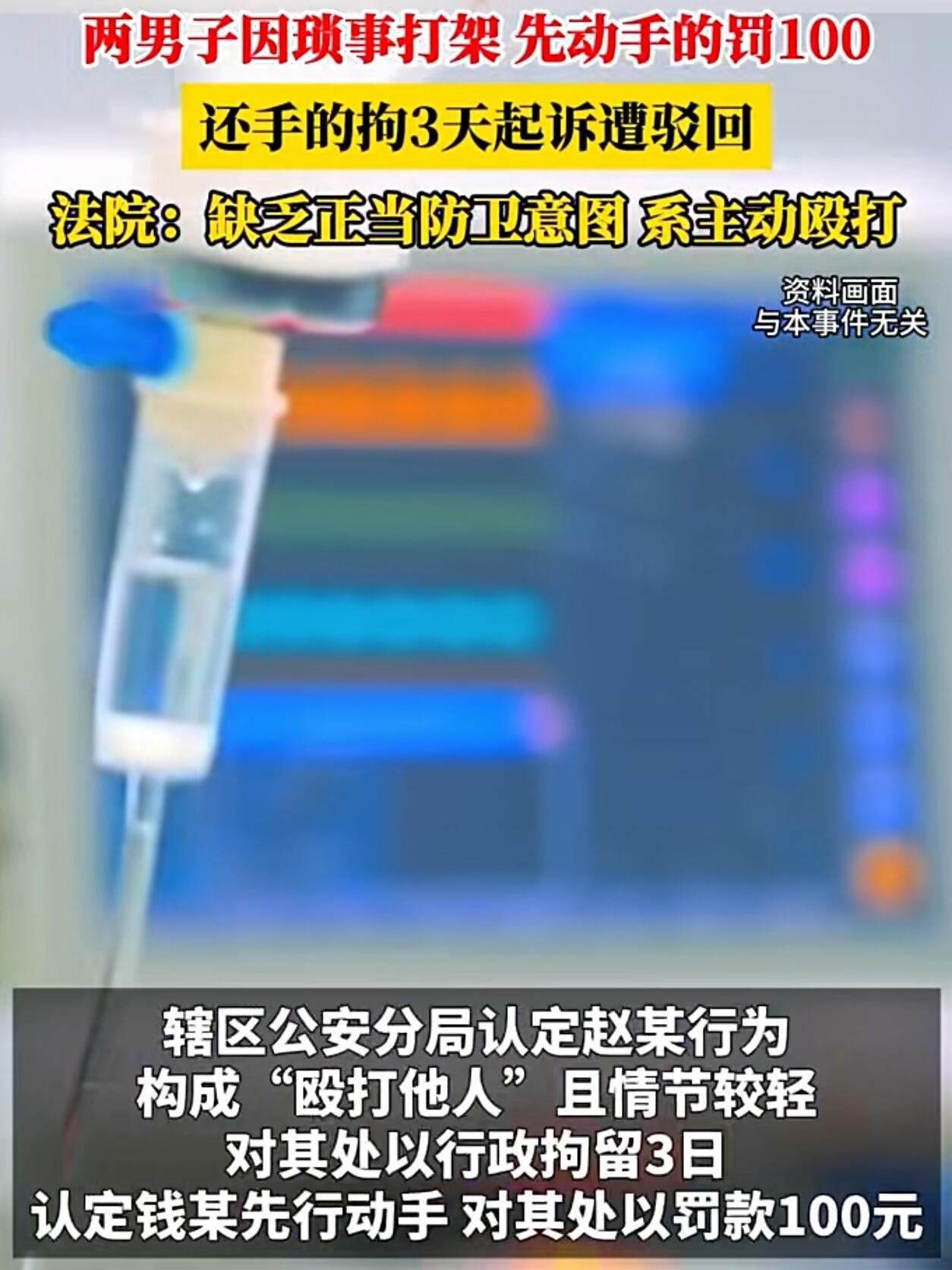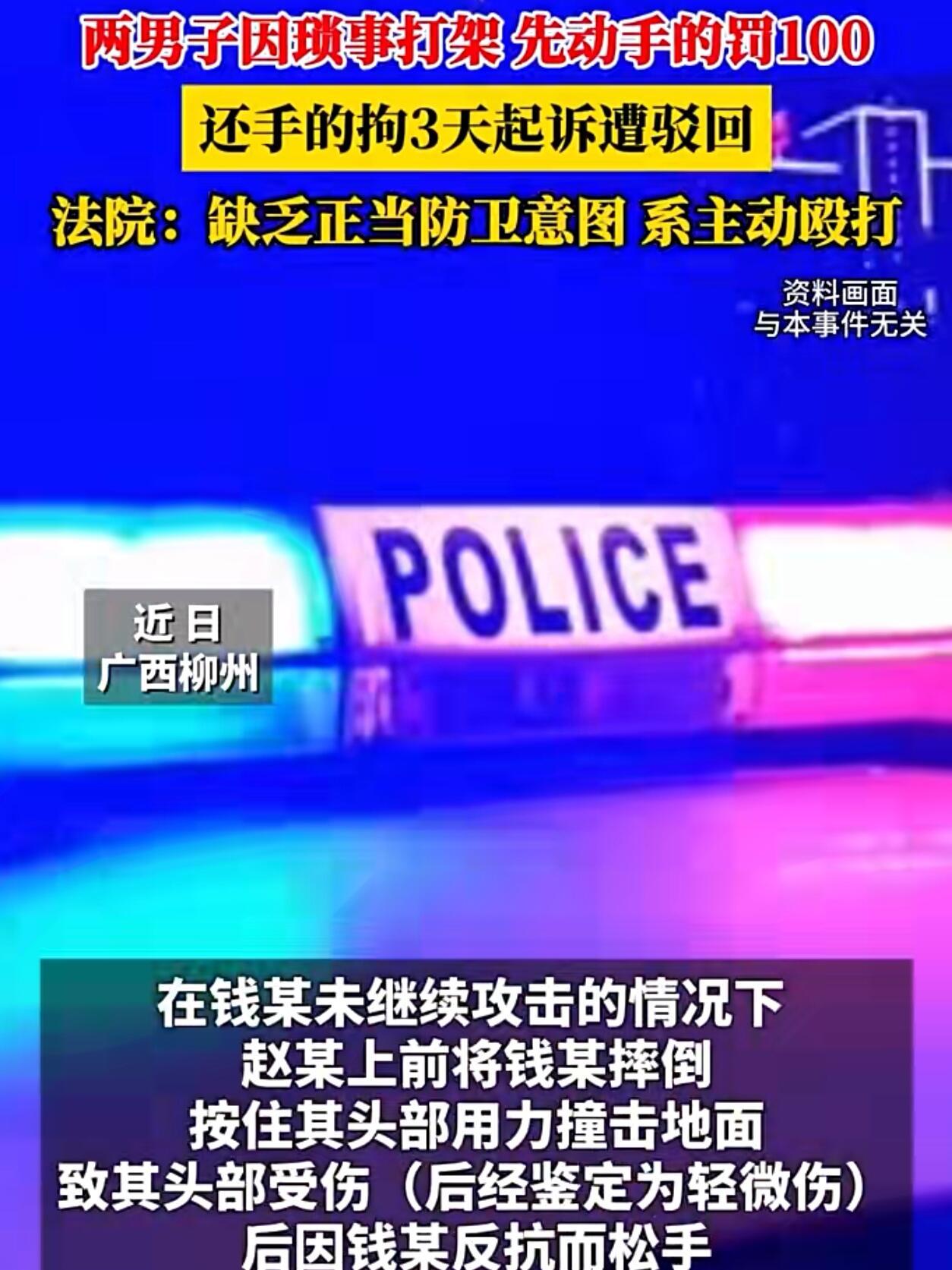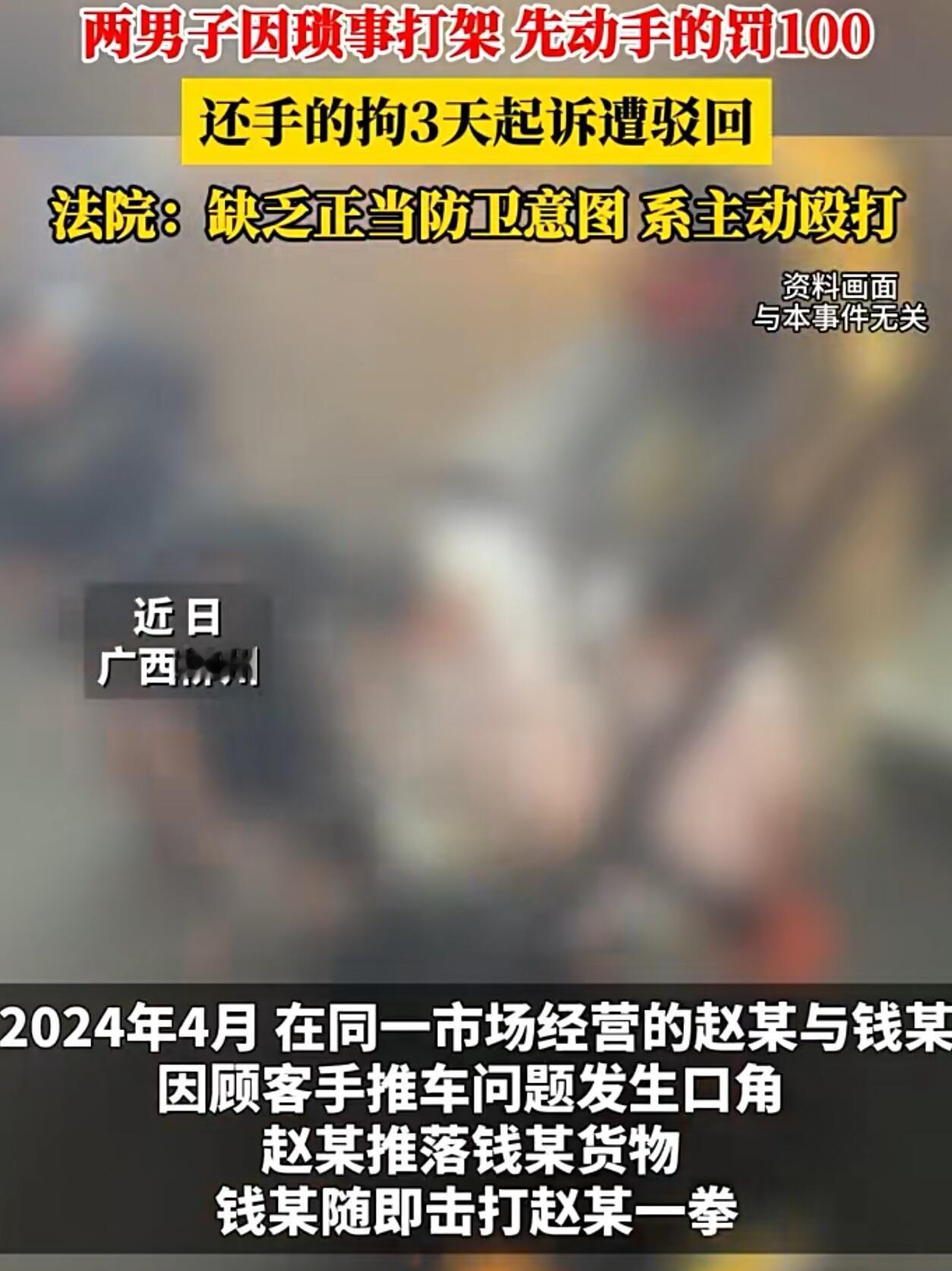 在广西柳州一个市场里,赵某和钱某是相邻做生意的摊位老板。本来该互相照应,结果因为一个手推车闹到派出所。 今年四月,赵某不知为啥,把停在钱某摊位前顾客用的小推车给推走了。就这点事,两人吵了起来。赵某一激动,把人家摊子上一些货给推掉了。钱某当时就火了,上去就给了赵某一拳。赵某挡了一下,人还往后退了两步。 这时候,钱某没再继续打,看着冲突就要停了。可没想到,赵某突然又冲上去,抓住钱某的手,猛地把人摔倒在地,接着按住他的头就往地上撞。钱某拼命反抗,这才挣脱开,头上已经流血了,马上报了警。 后来处理结果,先动手的钱某被罚了一百块钱。而赵某因为还手把对方打成了轻微伤,被拘留了三天。法院认为,在钱某已经停止攻击后,赵某的那个摔打和撞头行为明显过当了,属于主动打人。 但赵某不服气啊,他觉得是对方先动手的,自己还手是正当防卫,就把事情告到了法院。 这事吧,大家可能都有自己的看法。有人觉得,谁先动手谁理亏,赵某反击没错;也有人认为,人家都停手了,你还上去又摔又撞头的,这哪是防卫,这是报复。 其实法律上正当防卫不是“你打我一拳,我就能往死里还手”。它讲究个必要限度,而且一般是在对方正在动手的时候才能防卫。像这种对方停了,你再上去“补刀”的,很难算防卫。所以说,动手之前真得想想后果,打赢坐牢,打输住院,没一句是吓唬人的。市场里做生意,和气才能生财,为点小事闹成这样,实在不值当。