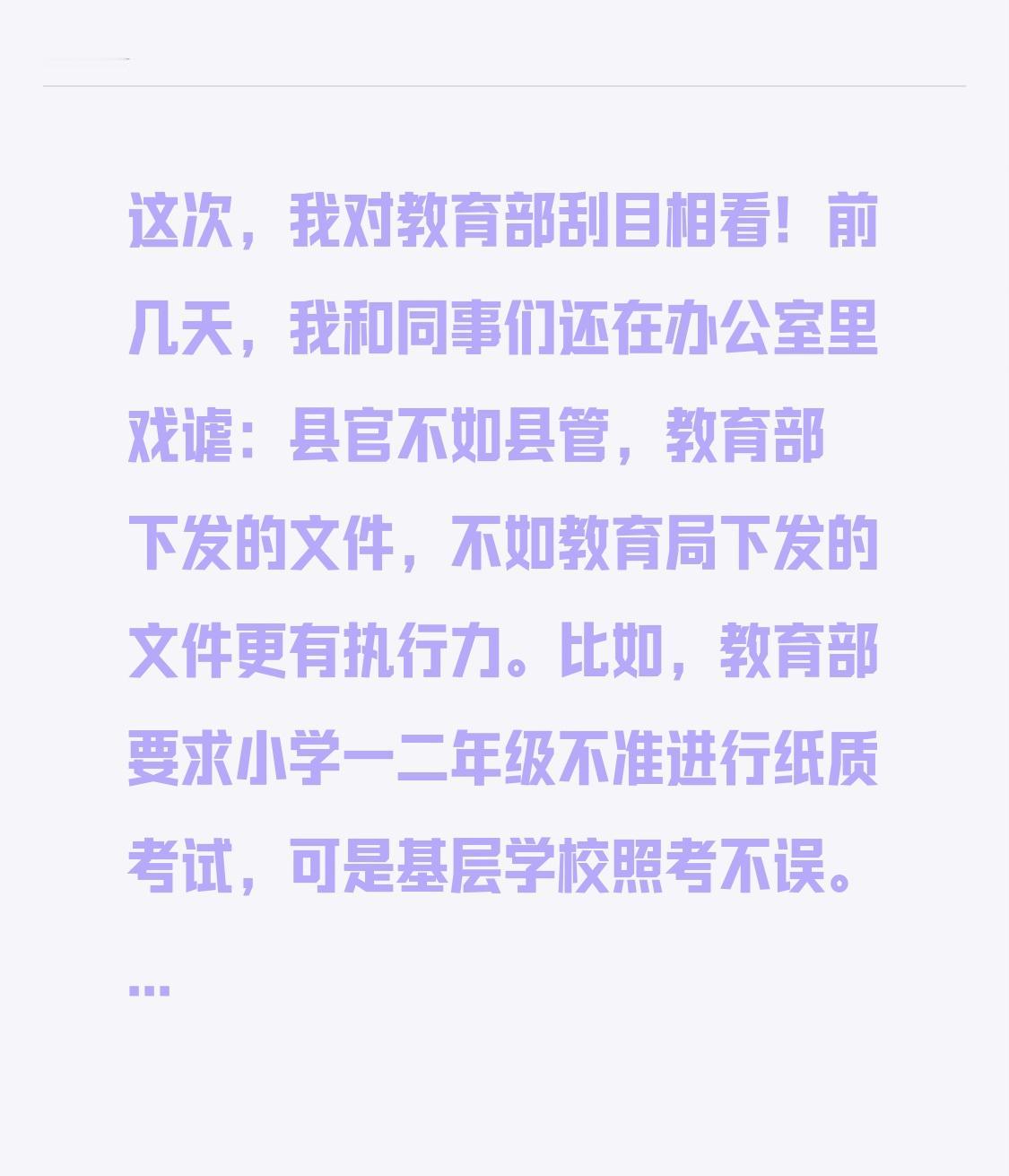 这次,我对教育部刮目相看! 前几天,我和同事们还在办公室里戏谑:县官不如县管,教育部下发的文件,不如教育局下发的文件更有执行力。 比如,教育部要求小学一二年级不准进行纸质考试,可是基层学校照考不误。 不仅考试了,还正大光明的给学生排名,给老师排名。 我们猜想,马上就要期末了,估计片区还会组织跨校统考,这样才能检测出各个学校的教学质量,和每位老师的教学水平啊! 还有,教育部要求加强学生体育锻炼,每天至少一节体育课。 结果怎么样呢?许多学校以缺乏体育老师为借口,一个班级每周只有一节体育课。 是真的没有体育老师吗?当然不是!学校想的是教学成绩,多上文化课才能提升教学质量。学生身体素质好不好,谁能看得见呢? 不过,这次真的不同了! 昨天接到学校通知,中小学生到校时间改为7:40以后,这是要取消早自习的节奏啊! 学校都发通知了,这次是真的要执行了。 看到此信息,工作群里一片欢呼。感谢教育部的这一规定,师生再也不用5点起床冒着严寒去上早自习了。 学生们也可以睡够9个小时了。 基层学校就应该这样,严格执行教育部的规定,开足体育课,高中正常双休,以前那种“上有政策,下有对策”的局面早就该改改了。 为基层学校的严格执行教育部规定叫好!