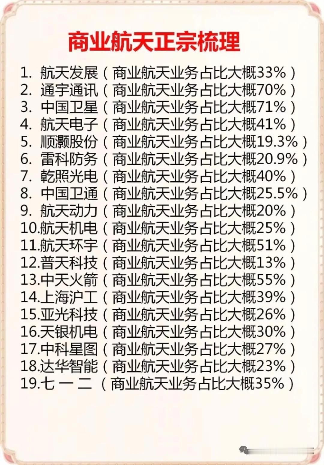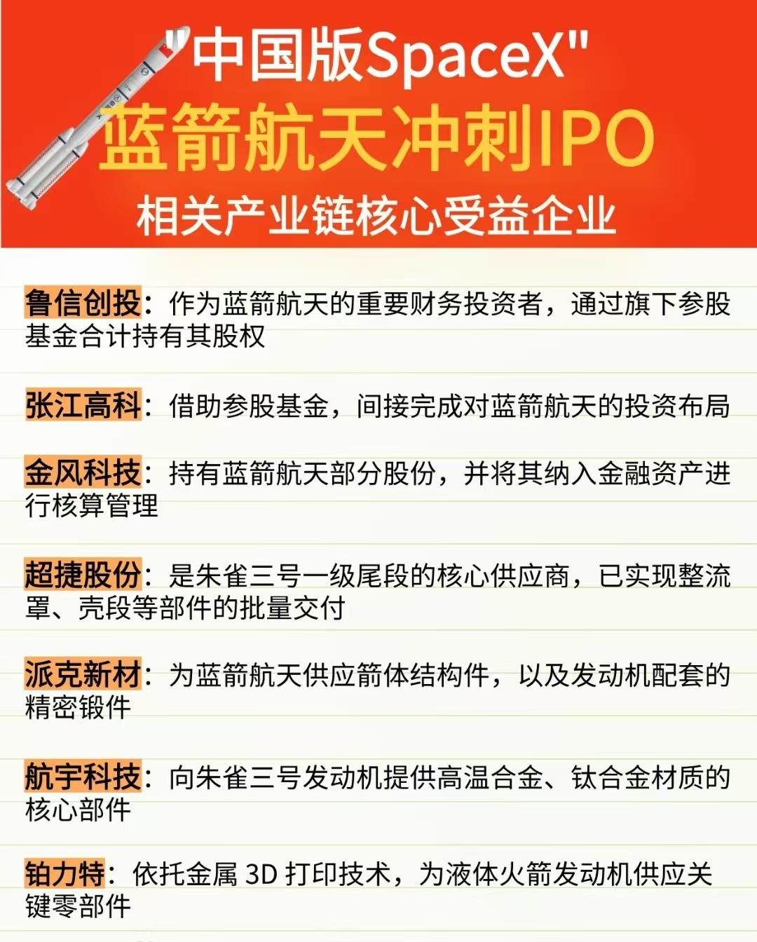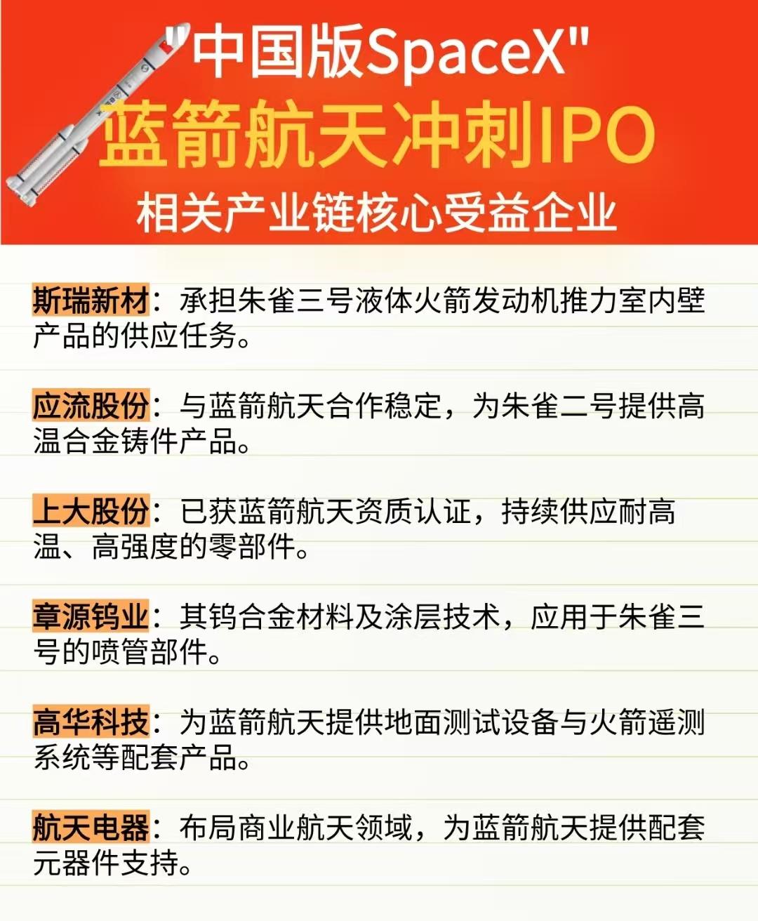 商业航天再迎政策东风!19家概念核心龙头业务占比率曝光…… 上交所发布商业火箭企业科创板第五套上市标准细化规则,明为商业火箭企业登陆资本市场划定清晰路径,行业发展按下加速键🚀! “中国版SpaceX”蓝箭航天冲刺IPO,商业航天产业链迎来新机遇!斯瑞新材、应流股份、鲁信创投等一众企业分别在零部件供应、投资布局等维度深度绑定蓝箭航天,成为产业链核心受益方,商业航天的资本版图与产业生态正加速成型🚀 国产可回收火箭虽接连两次试验失利,却未阻挡资本市场对该赛道的热情,可回收火箭概念板块逆势大涨。SpaceX、朱雀三号、天龙三号等相关产业链标的表现亮眼,超捷股份、派克新材、铂力特等供货企业,以及鲁信创投、张江高科等参股企业均跻身受益阵营,商业航天的资本热度持续攀升🚀 19家企业的商业航天概念龙头业务占比出炉:中国卫星、通宇通讯业务占比超70%位居前列,航天环宇、中天火箭等企业也在该领域布局颇深,为挖掘商业航天核心标的提供了明确参考。理财有风险入市需谨慎!