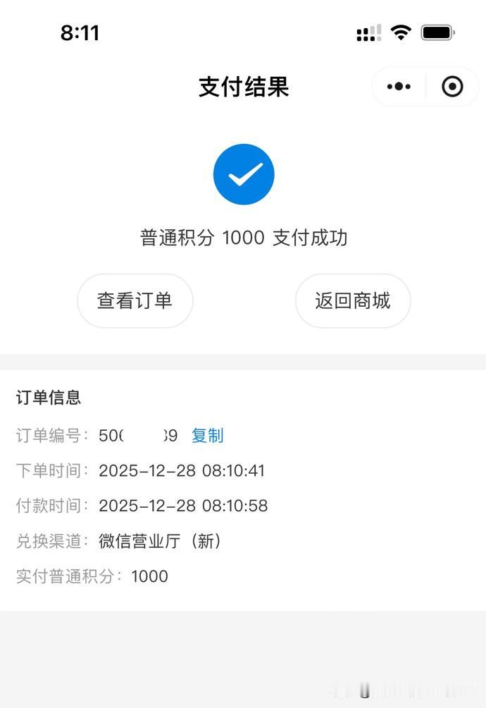 年底了,手机积分,可以兑换现金话费, 这个超级福利,大家可千万别错过! 不用的话,积分12月底直接清零,那就太可惜了。 联通、电信,通过微信小程序即可操作。 我的是电信,大概1000积分,兑换10元钱,总计4000积分,直接到账40元。 不管咋样,苍蝇蚊子也是肉啊! 感觉兆头不错啊,即将到来的2026年,大家一定鸿运当头!