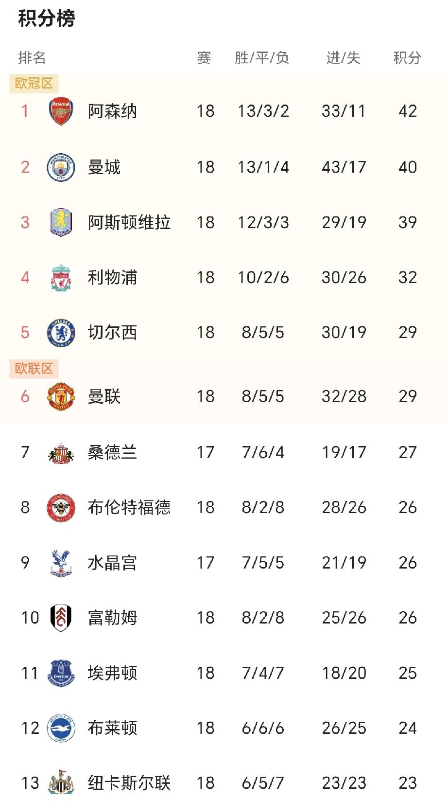 阿森纳2-1,曼城2-1,利物浦2-1,阿斯顿维拉2-1,英超前五就切尔西1-2输了……! 阿森纳不错,以前都是圣诞节期间掉链子,今年稳住了,虽然过程很惊险,好歹赢了,保住了联赛领头羊的位置! 曼城近期复苏势态非常猛,一度逆转阿森纳排名联赛榜首,无奈阿森纳今年不掉链子,目前只能以2分之差排名联赛第二,不过稳定的曼城对阿森纳的威胁太大了! 利物浦没有了加克波和萨拉赫,踢得更像一个整体,加克波和萨拉赫都非常的吃球,他俩拥有很大的球权,经常拖累球队!维尔茨打进利物浦首球,这是一个好消息! 阿斯顿维拉2-1击败切尔西,不仅成功压制住切尔西的联赛排名,自己的连胜势头一发不可收拾,英超已经11连胜,创下队史记录,可怜的切尔西成了背景板! 今年的英超好看,看点就是阿森纳会不会一如既往的掉链子,曼城能不能反超阿森纳,卫冕冠军利物浦到底能走到哪一步?阿斯顿维拉的黑马角色能否一黑到底……?英超 阿森纳 曼城 利物浦