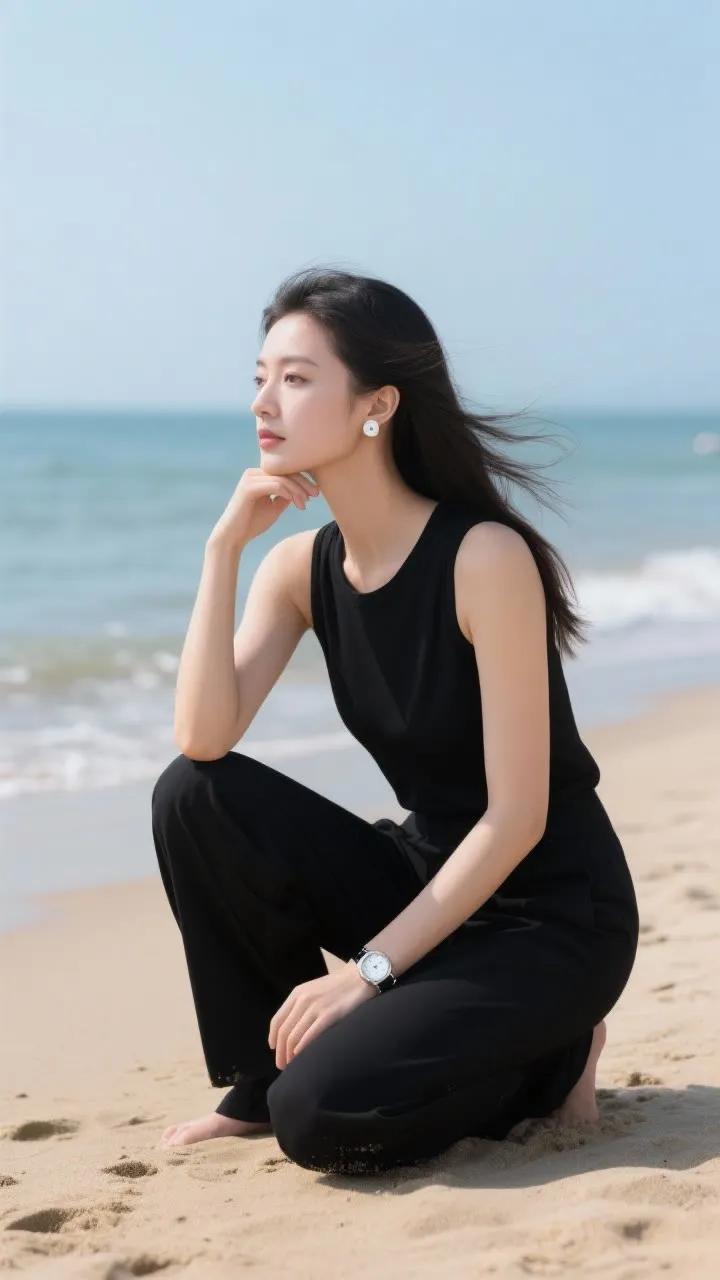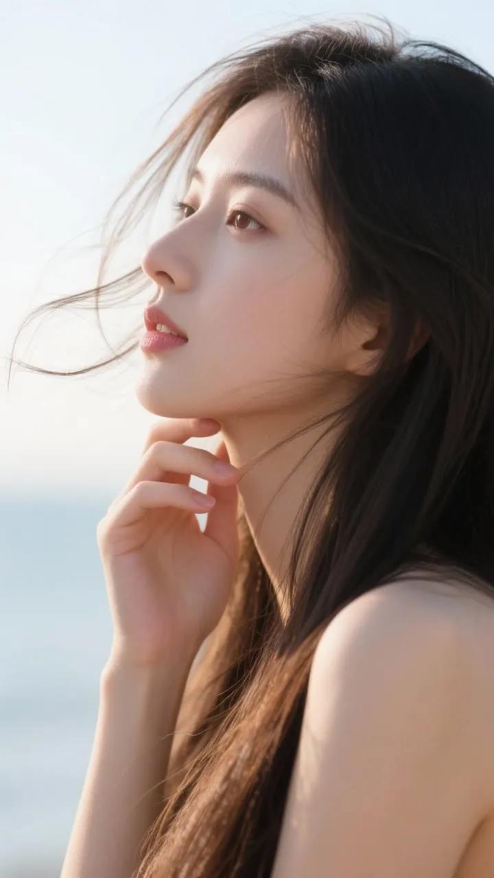 阳光下的梦幻少女,坐在松树下,裙摆随风飘动。
