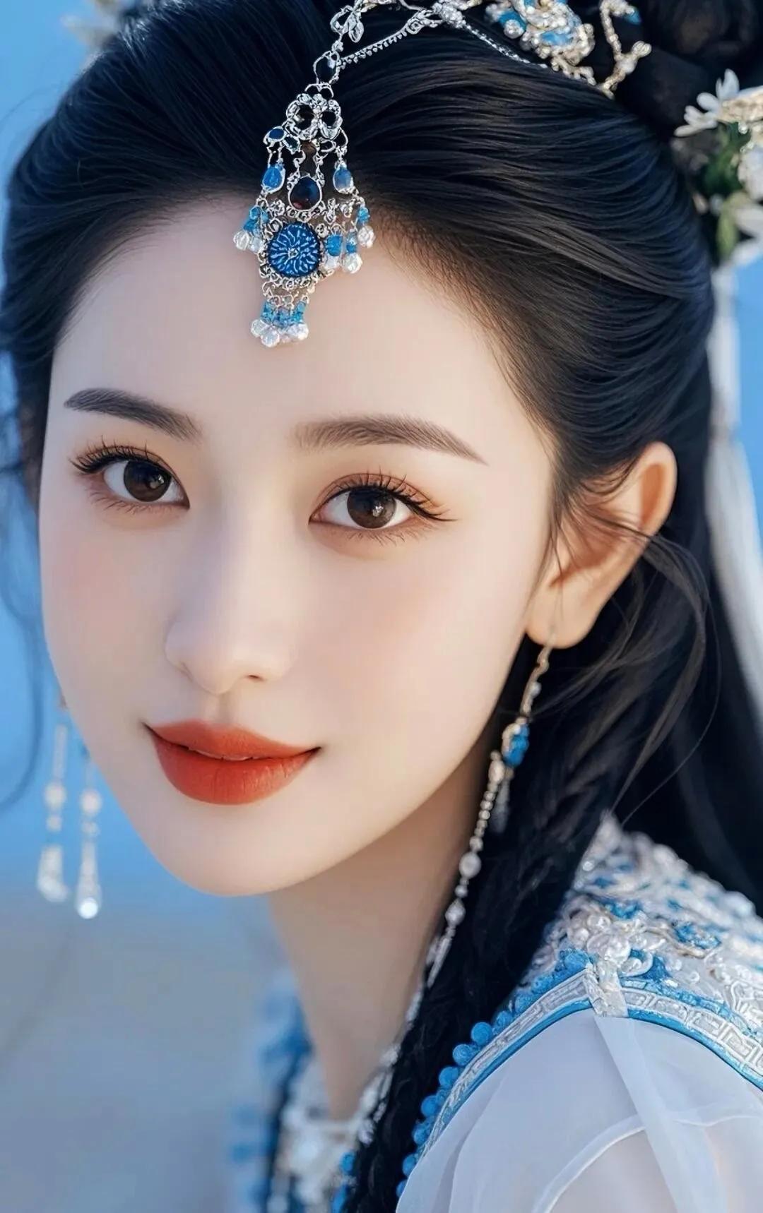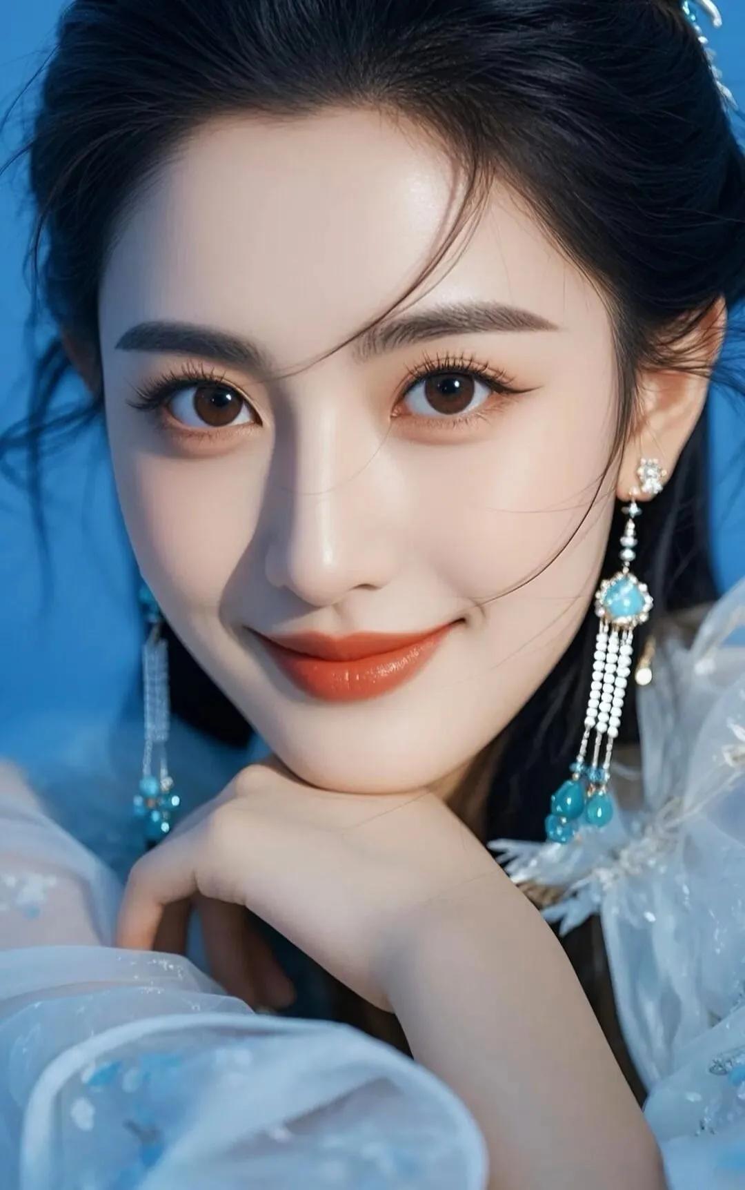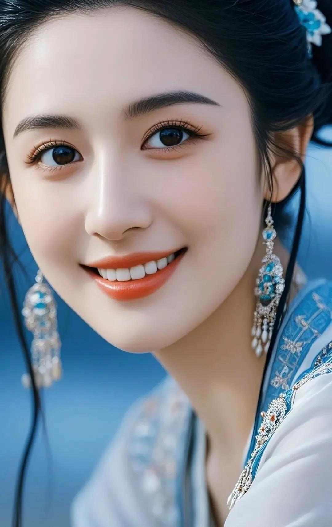 古风美人,笑靥如花,蓝衣飘飘,宛如仙子。