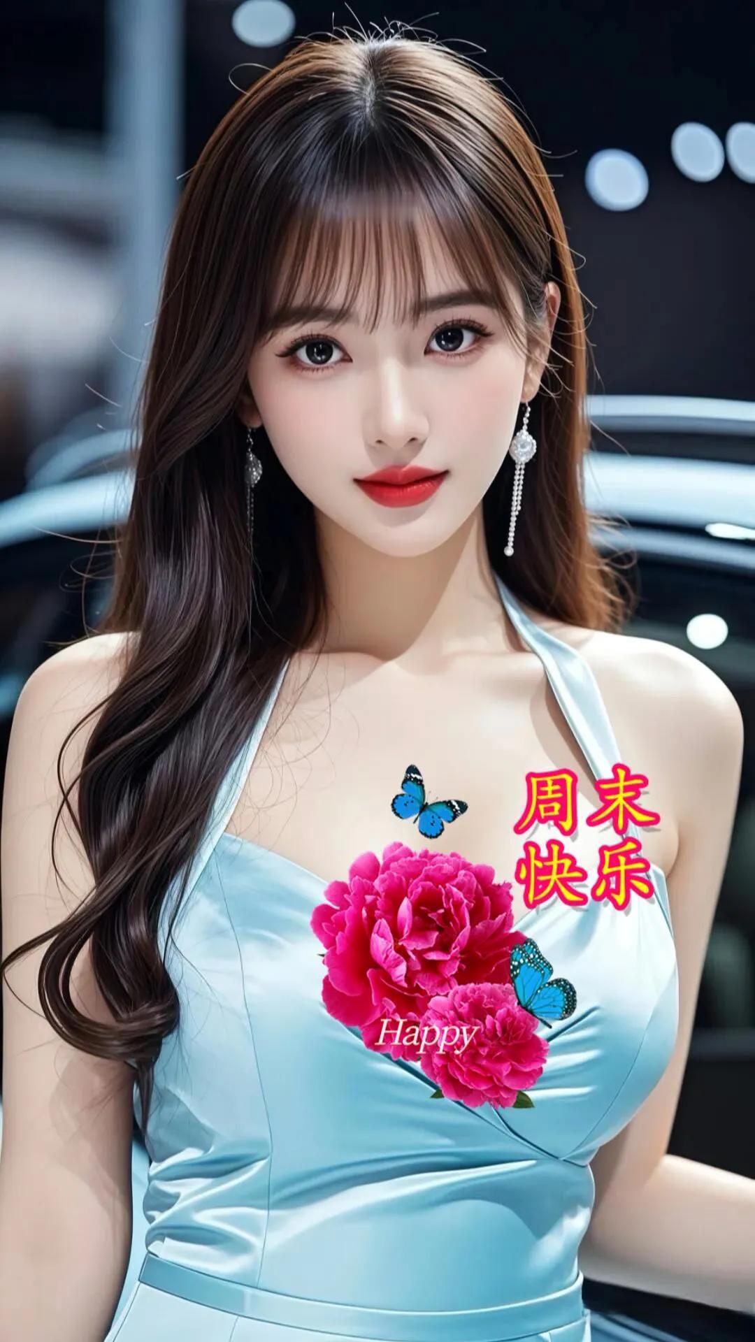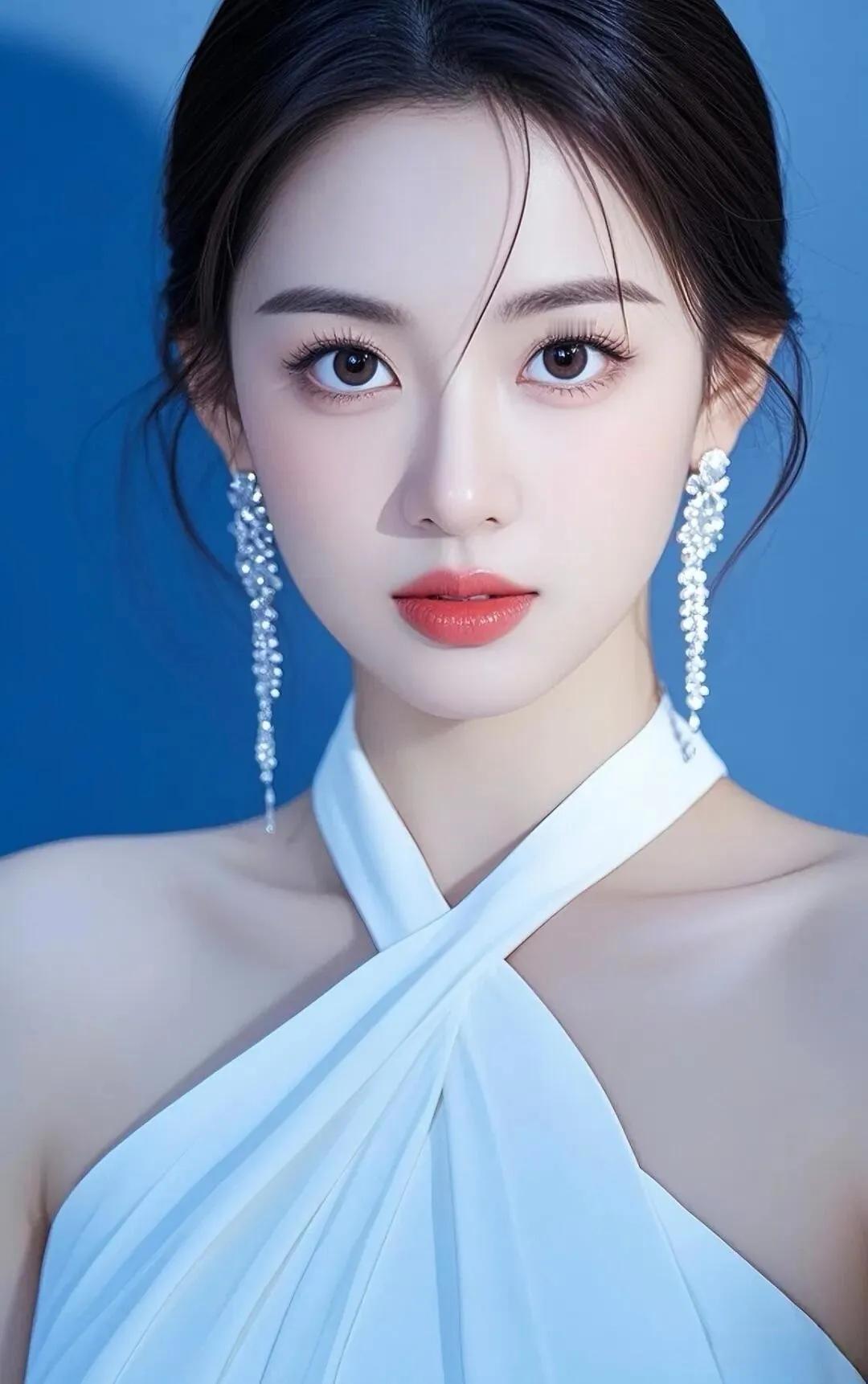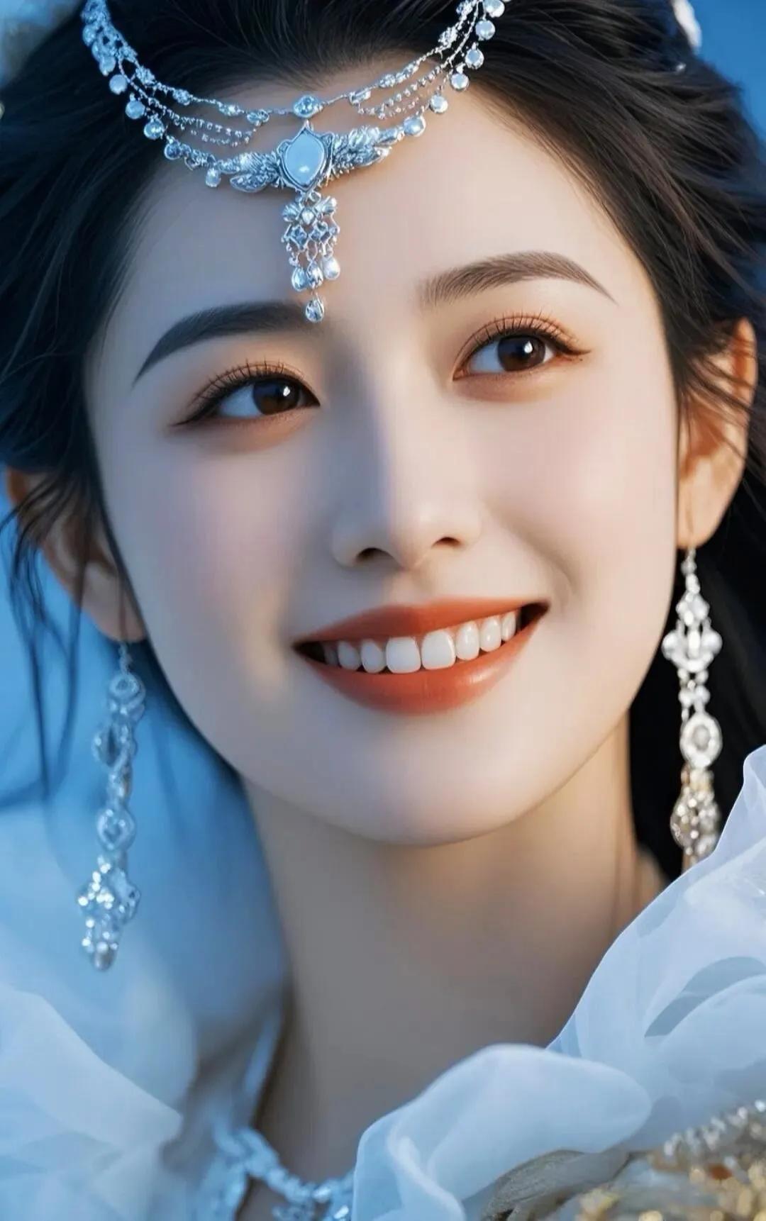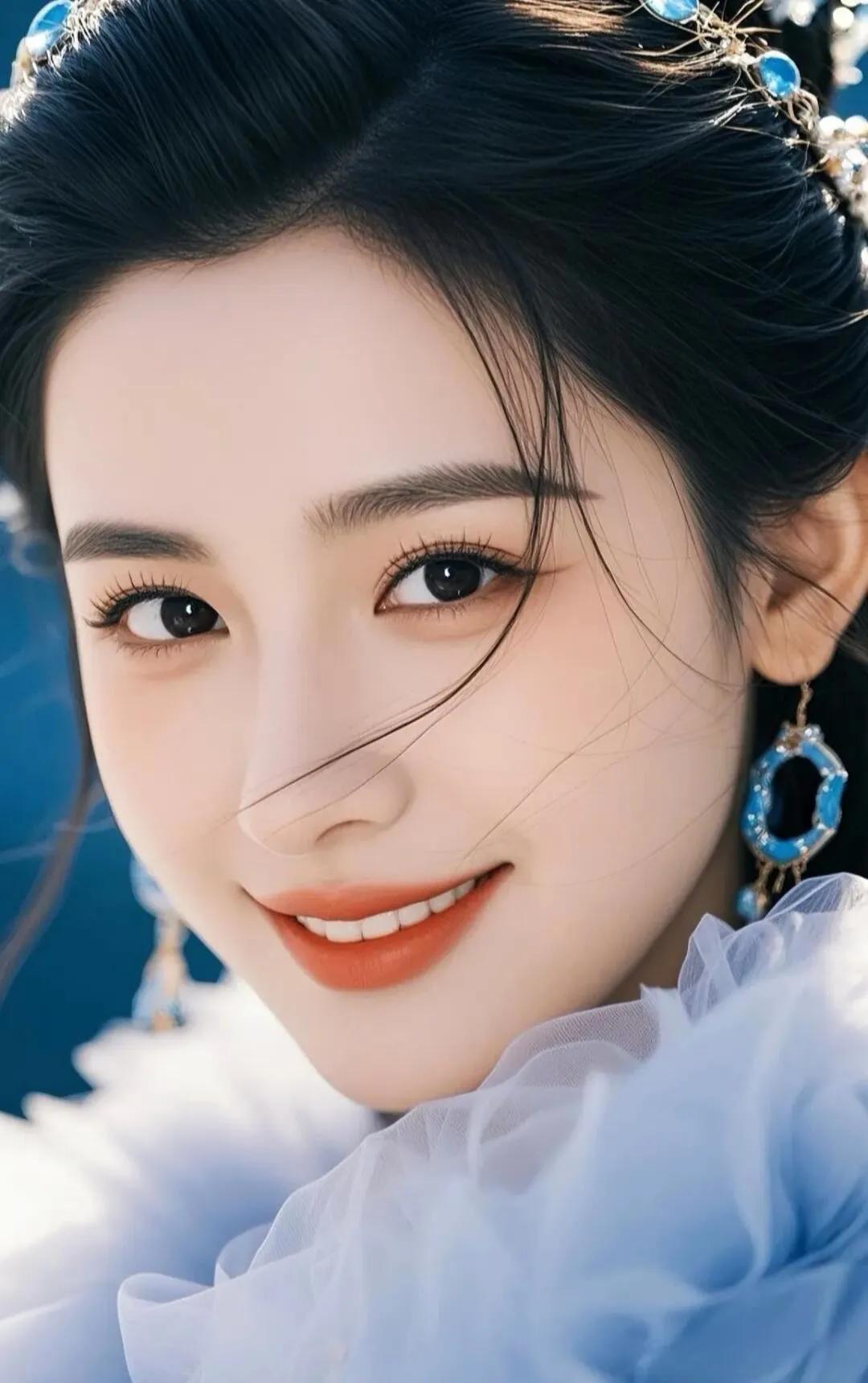 古风美人,笑靥如花,蓝衣飘飘,宛如仙子。