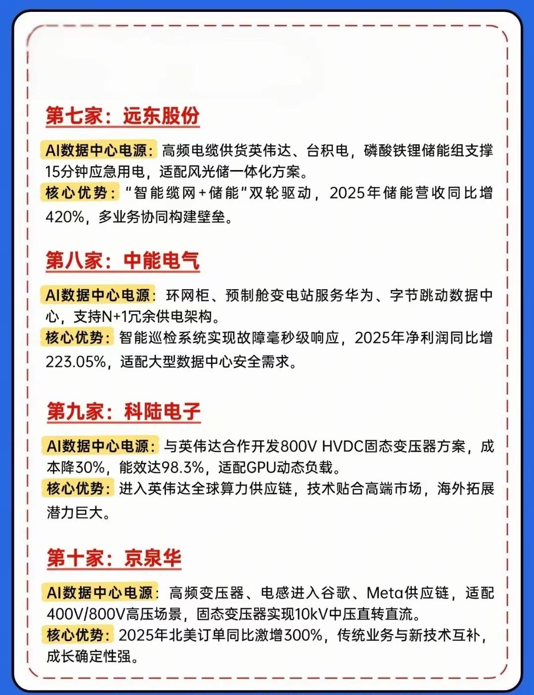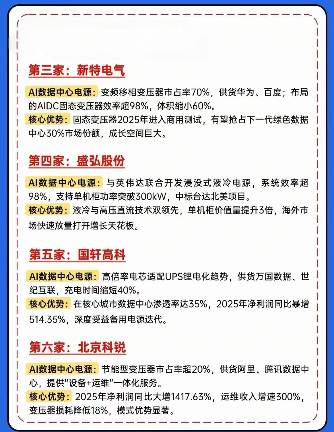 AI算力基建的核心电源环节,这些龙头的布局和优势值得重点关注! 政策、工程、技术三重利好共振,电网设备板块迎来确定性机遇!国家顶层战略定调“能源强国”,政策持续加码,明确支持特高压、智能电网装备创新与项目落地。 2027年全球AI数据中心电力缺口或达47吉瓦,北美部分地区已限制数据中心审批,“算电协同”与电网升级迫在眉睫。 受益方向:特高压、储能、高压直流(HVDC)、高效电源模块、配网与电缆需求爆发。行业龙头代表有哪些? 麦格米特:英伟达GB200/GB300服务器电源模块独家供应商,适配800V高压架。 科陆电子:与英伟达合作开发800V HVDC固态变压器方案,进入英伟达全球算力供应链。 京泉华:高频变压器、电感进入谷歌、Meta供应链,固态变压器实现10kV中压直转直流。 …… 具体名单见配图,资料取材网络仅供参考不能作为投资依据,理财有风险入市需谨慎!AI算力板块 ai算力产业链 国产算力概念股 算力板块机会 AI算力公司 算力行业 AI算力产业