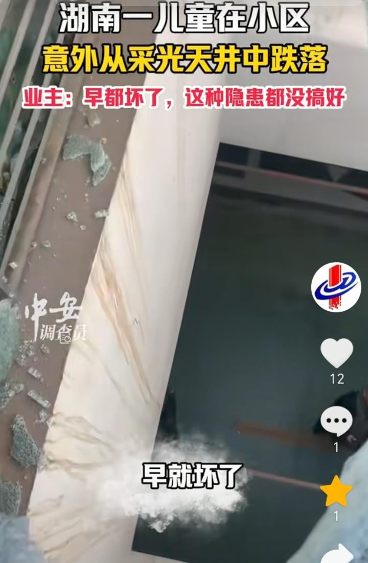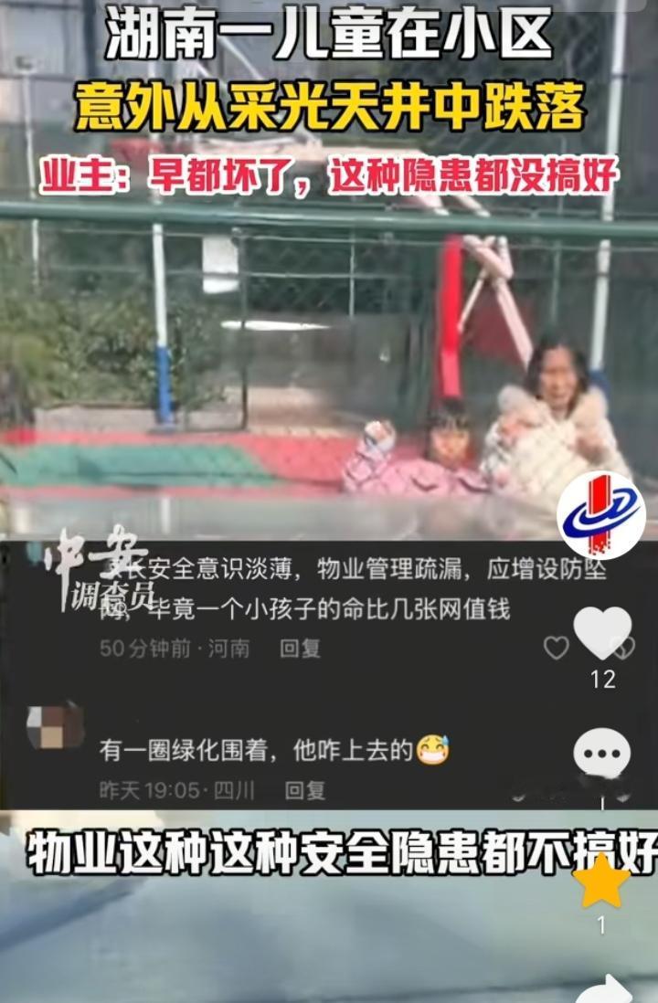 没有安全意识!湖南株洲,一小区采光天井破了一个大洞,存在很大安全隐患,物业却是对此置之不理,结果一个小朋友玩耍不小心直接掉了下去。 采光天井坏了,物业就应该及时处理,而不是对此置之不理,对于大人来说肯定是不会掉下去,但是对于小孩来说那就不一定,因为小孩比较顽皮,安全意识浅薄,所以这就存在安全隐患,就因为物业安全意识差,没有及时修理,所以才有小孩掉了下去,当然小孩不小心掉下去物业有责任,家长也是有监管不到位的责任。 作为物业最起码要保证小区的设施安全,虽然小孩掉下去没有说情况怎么样,但是看那高度掉下去住院应该在所难免,对此物业也是要承担一定费用。