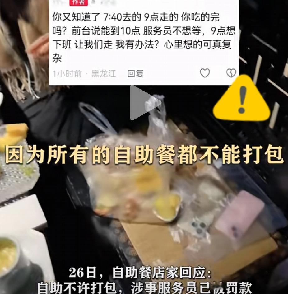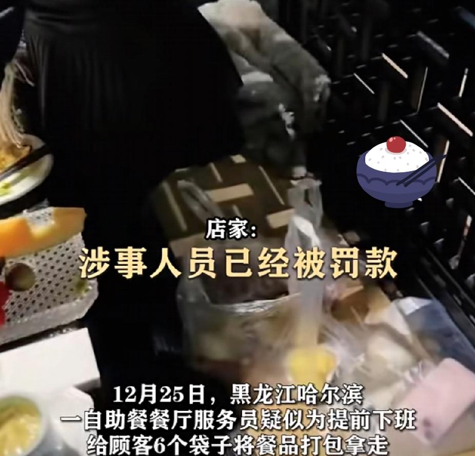 “自助餐”服务员为早下班,给顾客6个袋子让顾客“打包”带走,顾客拍下视频发布网上称:“下次还来!”店家:“涉事服务员已被罚款!” 12月25日,黑龙江哈尔滨一自助餐厅的服务员疑似为了早下班一小时,给了顾客6个袋子,让顾客把餐品打包带走。据悉,该自助餐厅是晚上十点下班,顾客7:40开始用餐,9:00还没有吃完,这时只剩下一桌了。 服务员拿出6个袋子递给顾客,让顾客打包回家吃。 第一次听说自助餐还能打包?顾客一边打包一边拍下视频发到了网上,并配文字“吃自助,服务员给了6个袋子打包,下次还来!” 视频一经发出后,就有网友觉得这位顾客这事做的不地道,都知道自助餐是不能打包的,这不是自己占了便宜,还害了服务员吗? 这位顾客却表示:“服务员自己想早下班让我们打包,我们有什么办法?” 店家得知后,对涉事服务员进行了罚款并声明:自助餐不允许打包且有明确的用餐时间规定,点餐两小时,用餐三小时!该服务员明知故犯,必须处罚! 自助餐不能打包且有时间规定,这是人人皆知的吧!如果顾客都从自助餐厅打包食材,那自助餐厅不就成了廉价菜市场了? 服务员的行为损害了餐厅利益,该罚! 对于此事,你怎么看呢? 自助餐