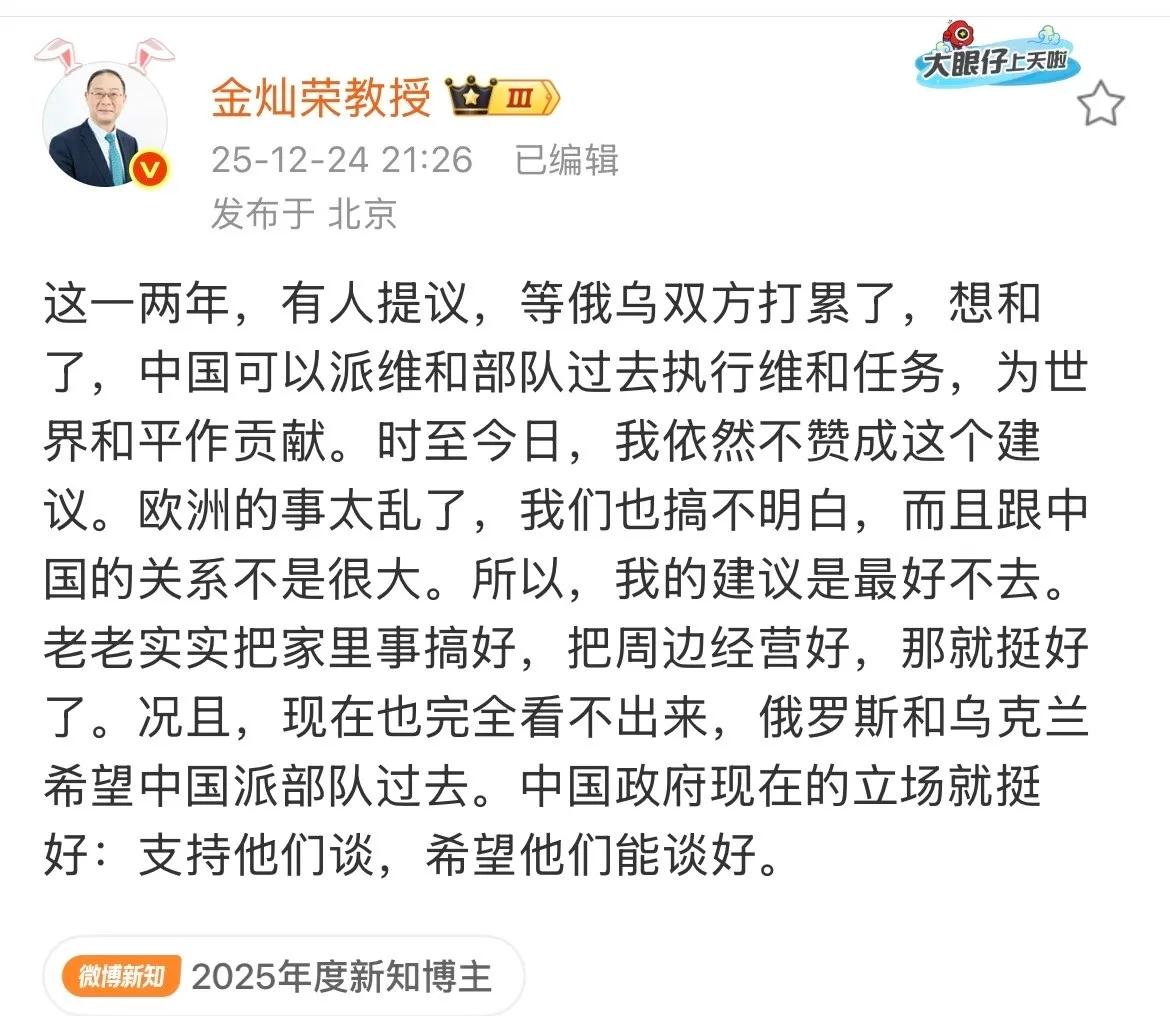 这时候去会被美俄认为我们想摘果子,会被欧盟认为来了根稻草,出力不讨好。完全没有任何必要参与,让他们自己撕就很好,撕的越久越好,动荡的欧洲和衰弱的俄罗斯最符合我们利益。就像给人介绍对象一样,过好了未必记得你介绍人的情,过不好就埋怨你给介绍的什么烂人。以前看过一个人写的,介绍一对夫妻就是没过好,总吵架,一吵架就双双找介绍人“评理”,弄得介绍人烦不胜烦!俄乌关系也是,你觉得和平和少死人最重要,给人劝和了,但深层次矛盾没解决,各自心里都觉得亏,还是有仇,回头把怨气撒咱们头上,岂不是好心办坏事?让他们打去吧,只有撞了南墙撞疼了,自己有了切身感受不能再打,才能心甘情愿停火止战,对外没有怨气。和人的成长一样,老人无论怎么教育子女如果那样做会如何如何危险,子女没有切身体会,就会觉得小题大做,就会不屑于顾,坚决不听老人言,回头非得吃了大亏,栽了大跟头,切身损失惨重,才能有所体会,有所感悟,却也晚了(只能视作亡羊补牢未为晚也吧)。