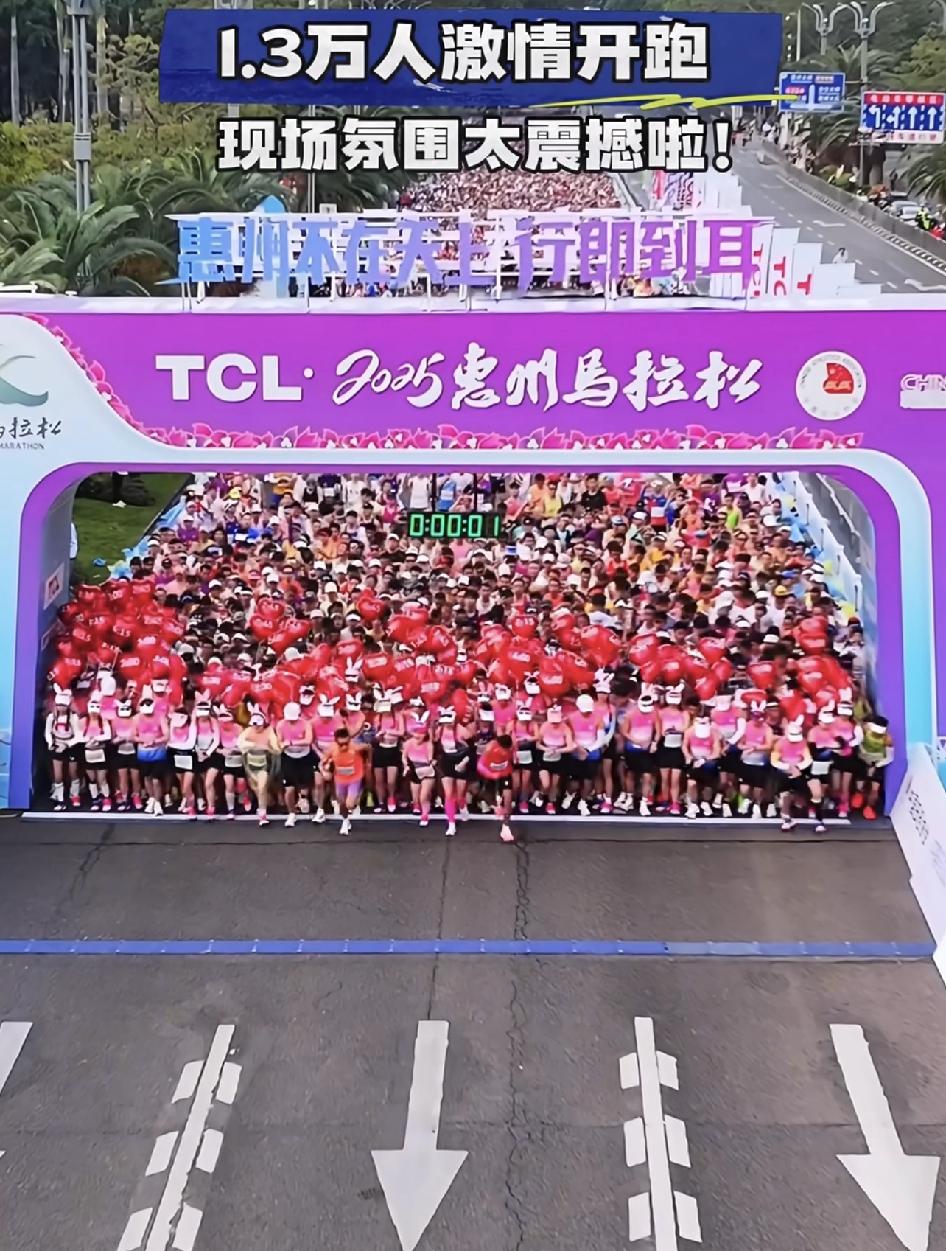 2025惠州马拉松,1.3万人激情开跑! 现场氛围太震撼啦!就是不知道那么长的队伍,排在最后一个和第一个距离那么远,那是计算个人时间长短还是计算第一个冲向终点的人为冠军呢?