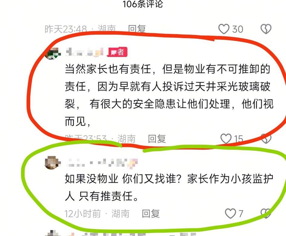 湖南株洲某小区,一男童从采光天井台玻璃掉落,摔到高度约8米的地下车库,120现场初诊脚断了。评论区里说家长的比说物业的多。 采光台在花圃草丛里面,周边是绿化带。 据知情人透露,采光台上玻璃早就裂开了,物业一直没管,没有护栏,台子也太矮,小朋友一爬就能上去。 这事物业与家长两边都脱不开责任,哭的不一定是在理的。 作为家长来说,还是先得嘱咐自家宝贝别去犄角旮旯的地方玩儿,告诉他们哪里有危险,正常引导,防患于未然吧!