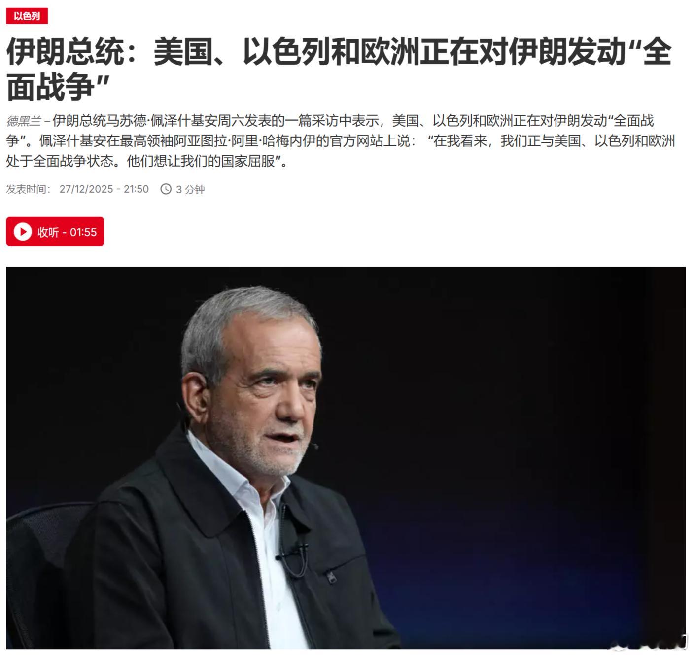 伊朗总统:美国、以色列和欧洲正在对伊朗发动“全面战争”。你看,你不是号称“亲美”吗?伊朗亲美派上台,放弃了对哈马斯和叙利亚的支持,结果呢?就是战火燃烧到伊朗本土。面对敌人的步步紧逼,你越不敢打,你失去的就越多。