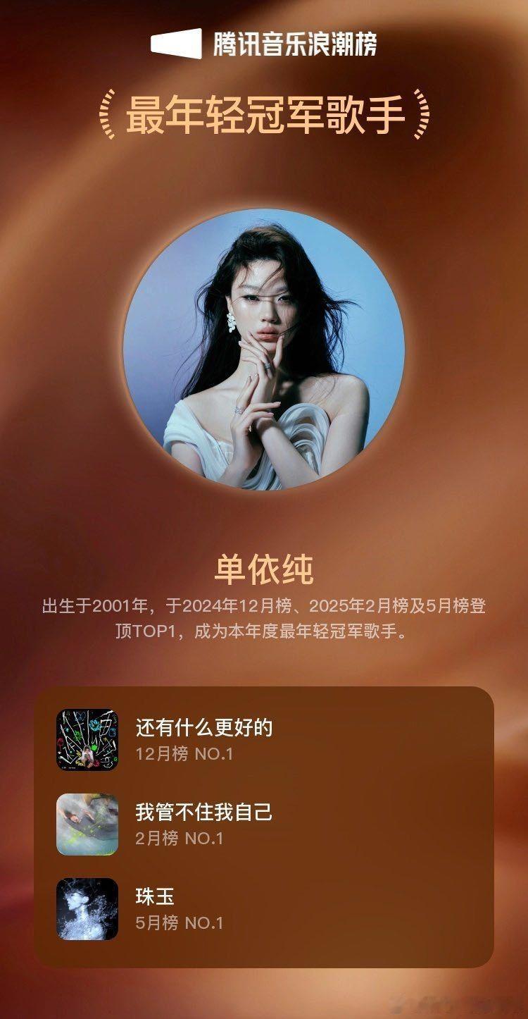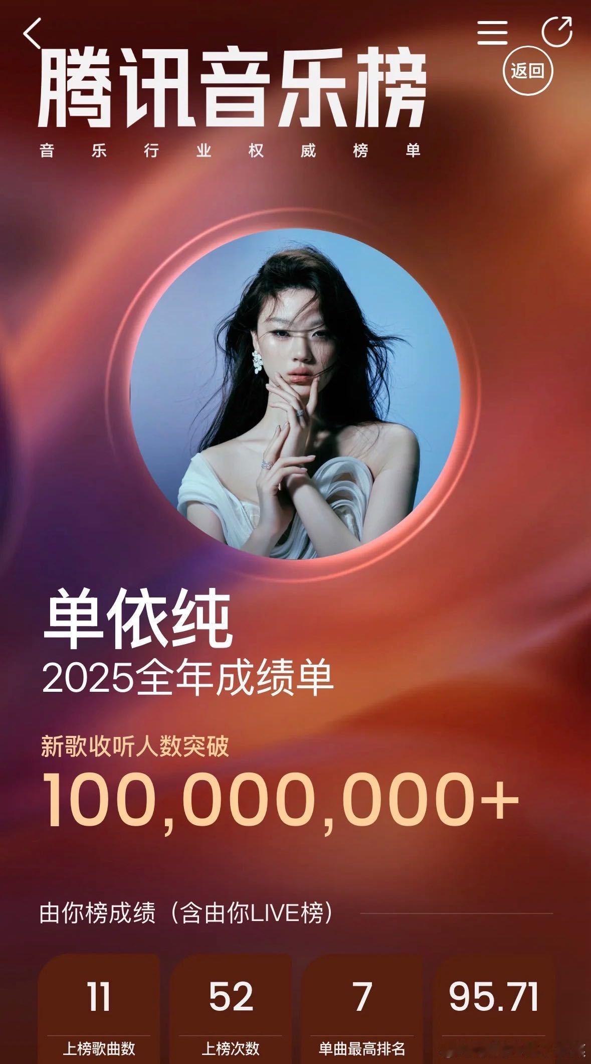 单依纯连续2年新歌收听破亿 就这个权威!连续2年新歌收听破亿,而且今年是唯二收听破亿的女歌手!今天也是发了自己的新专辑《纯妹妹》,里面每一首歌我都特别喜欢啊,真的是仙品中的仙品!一直对自己的音乐很有追求也很努力的一个小女孩,超级期待以后会给我们带来什么样优秀的作品呀~