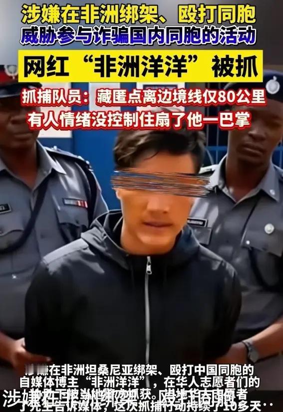 涉嫌在坦桑尼亚绑架、殴打同胞 网红“非洲洋洋”被抓。抓捕队员讲述:藏匿点离边境线仅80公里,有人情绪没控制住,扇了他一巴掌。 据媒体报道,涉嫌在非洲坦桑尼亚绑架、殴打中国同胞的自媒体博主“非洲洋洋”在华人志愿者们的协助下,被当地警方抓获,社交平台传出的视频显示,“非洲洋洋”被戴上了手铐叙述案件情况……案件将依坦桑尼亚法律审理,赵俊洋涉嫌绑架、虐待、抢劫等罪名。中国驻坦使馆及国内警方已介入协作,推动中坦联合调查。