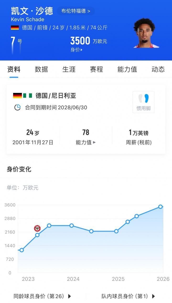 沙德现年24岁,身高1.85米,他2023年从弗赖堡转会布伦特福德,本赛季他为小蜜蜂出战17场英超,贡献6球1助,目前德转身价3500万欧。