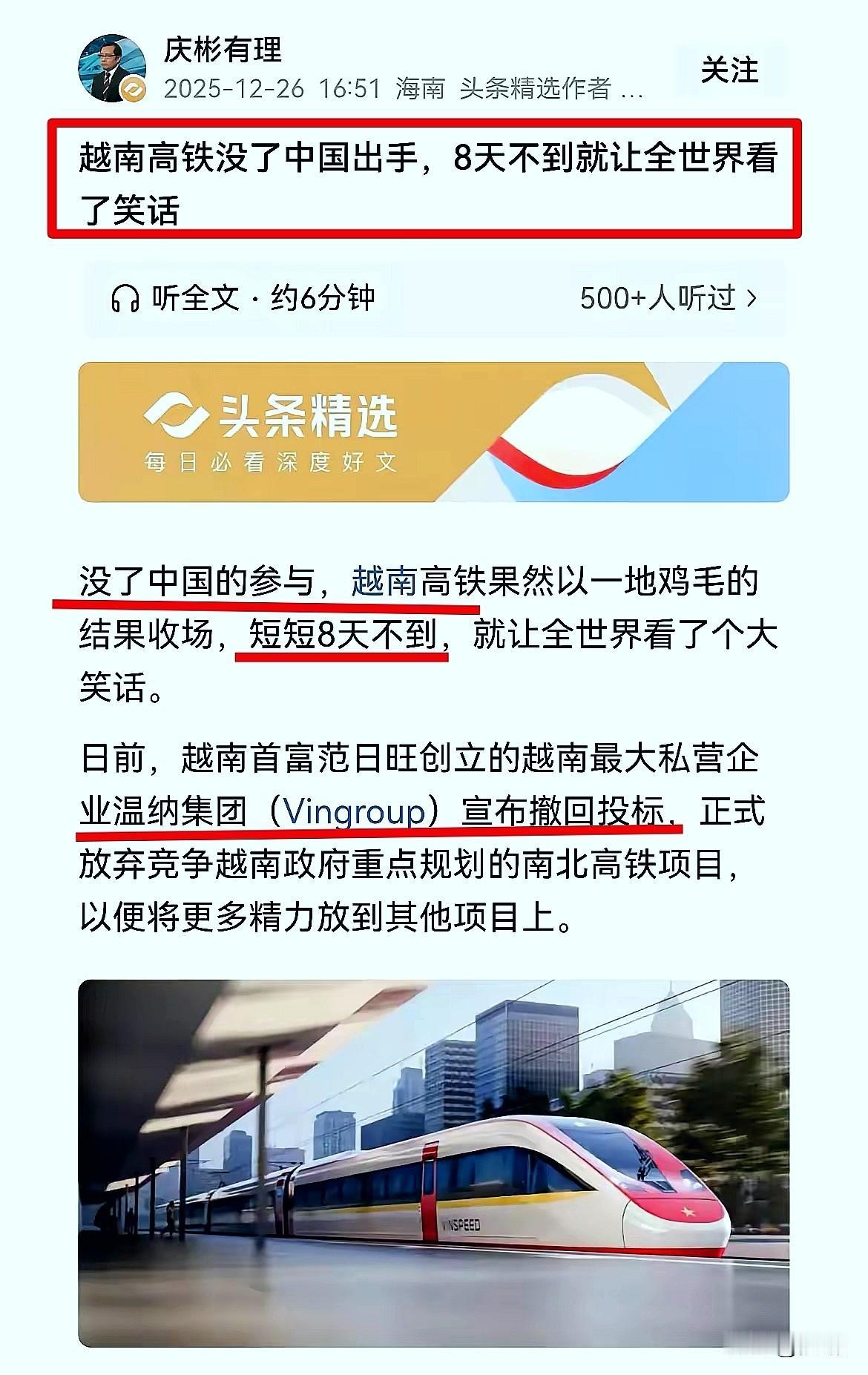 这事从一开始,中国就心如明镜。 越南搞了个高铁建设项目的局,还拉西门子当“托儿”,满心以为能引中国入局,借机捞点投资和技术,把自家国企做大做强。可咱中国一眼就识破了这小算盘,压根没去抢,结果“托儿”中标后骑虎难下,VANFAST只能弃标。 越南到现在都没搞明白,自己啥家底都没有,哪来的底气觉得别人会倒贴着帮忙?前些年国际市场对第三世界国家争夺激烈,让越南产生了错觉,以为自己成了“香饽饽”。可时代变了,红利期早过了。就像日本在越南基建中标项目20年没进展,这不就狠狠打了越南的脸嘛[呲牙] 越南该醒醒啦,认清现实才能找到正确发展路。越南高铁