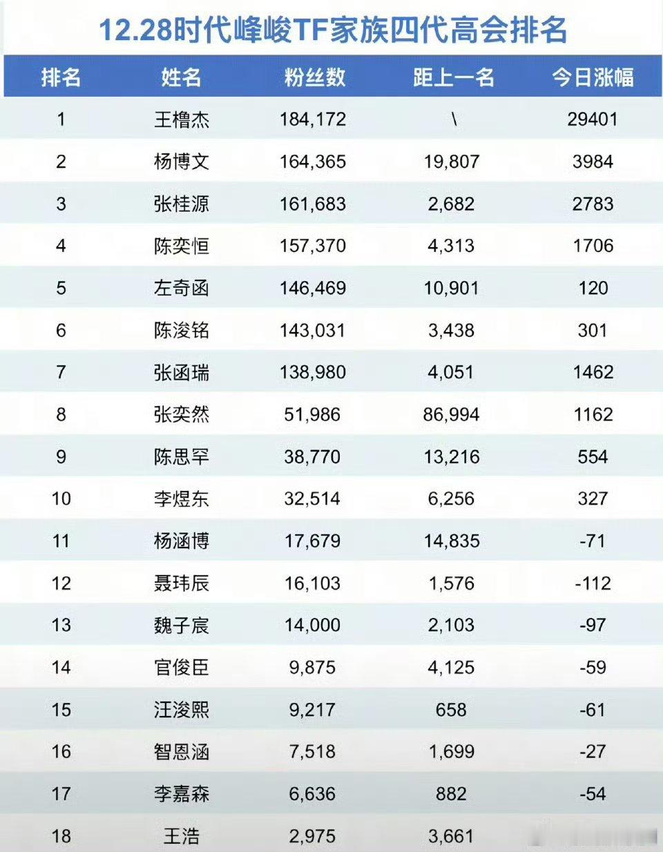 时代峰峻TF家族四代练习生高会排名 王橹杰高会第一