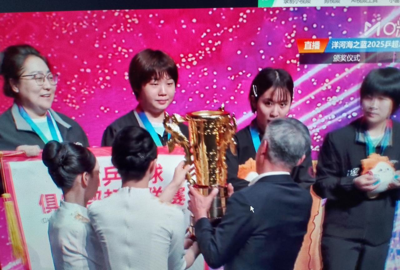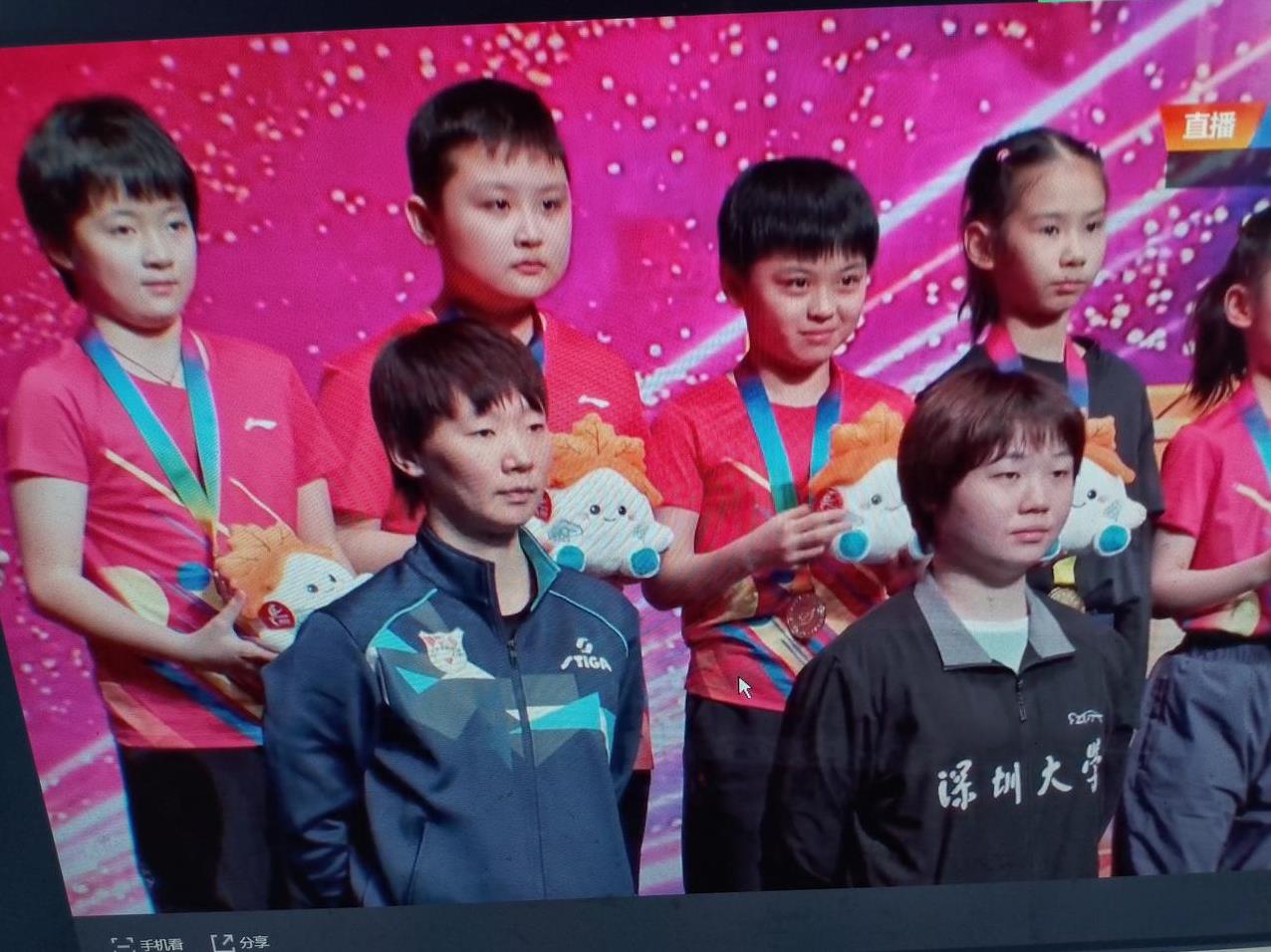 秦志戬来了! 王励勤没到。 乒超联赛颁奖图片来了! 今年的乒超联赛女团决赛,深大队冠军、山东鲁能队亚军,上海龙腾队季军。 颁奖典礼上,王曼昱和蒯曼先给国少队颁奖,我只认识一个叫陈思杨的小女孩,还是因为以前老是看到报道说是她赢了王楠的女儿笑笑,不过,今年没看到有人报道笑笑,是不是没参加呀! 奖杯真是重,幸亏来了一个平野美宇的教练张成,不然,那个教练真举不起来。 秦志戬出席颁奖仪式。 风水轮流转,今朝到深大。 不过,没有孙颖莎的上场领奖,还是少了好多欢呼声。 没有燃爆全场。 恭喜深大队夺冠! 不过,怎么没有评选最有价值球员与女双第一? 会不会在晚上评选?