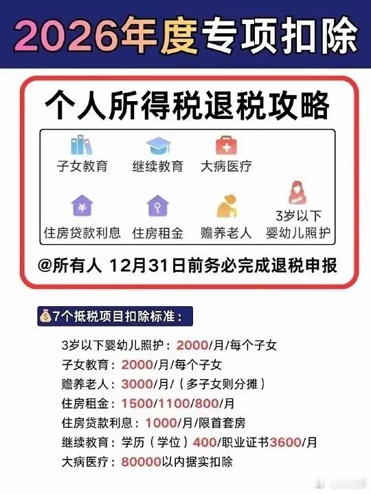 个税APP确认信息将截止年底最容易被忽略的一件小事:个税专项附加扣除确认,12 月 31 日截止。很多人以为我去年填过了,应该自动算吧?但现实是:不确认,就可能按没填处理。尤其这几项,真的很值钱:有娃的:3 岁以下婴幼儿照护 + 子女教育,一个孩子一个月就能扣 4000,夫妻谁来填,差别很大,建议收入高的那位来。要养老的:父母满 60 岁就能扣,独生子女每月 3000,非独生子女要分,但也别白白放弃。住房这块最容易选错:房贷利息和租房只能二选一,有首套房贷款的,千万别手滑选成租房。还有继续教育、大病医疗,不少人嫌麻烦不填,但那都是已经发生过的支出,不填等于白给。操作其实很简单:个税 App → 2026 年度专项附加扣除没变就一键带入,有变再改。说句大实话:这一步不费时间,但能少交不少税。年底事情多,别把这笔钱忘了。