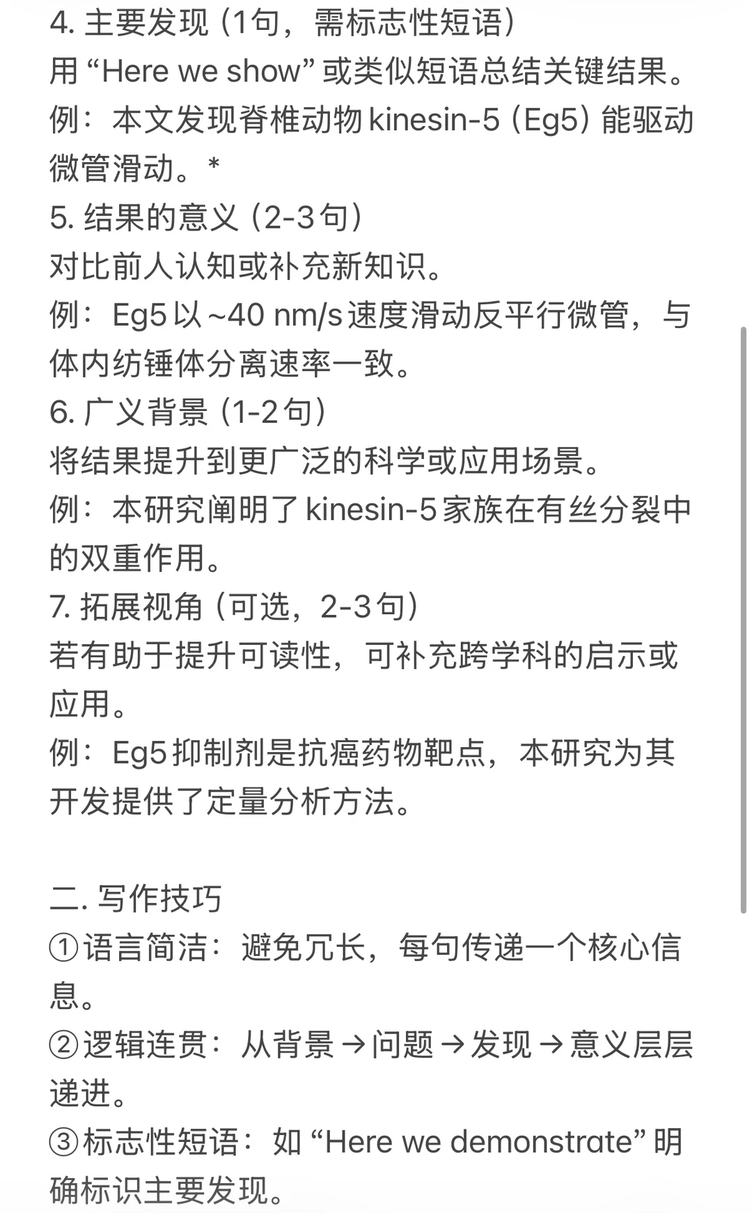 一、10句话写成摘要(具体结构)Nature摘要通常由一个段落构成,包含以下核心部分(总字数建议150-250词): 1. 引言(1-2句) 简要介绍研究领域,确保任何学科的科学家都能理解。 例:细胞分裂中,微管马达蛋白驱动纺锤体组装。2. 背景深化(2-3句) 提供更具体的背景知识,面向相关领域科学家。 例:双极纺锤体的形成依赖kinesin-5家族马达蛋白,但其具体机制尚不明确。3. 研究问题(1句) 明确指出本研究解决的核心问题。 例:然而,kinesin-5在此过程中的精确作用未知。4. 主要发现(1句,需标志性短语) 用“Here we show”或类似短语总结关键结果。 例:本文发现脊椎动物kinesin-5(Eg5)能驱动微管滑动。* 5. 结果的意义(2-3句) 对比前人认知或补充新知识。 例:Eg5以~40 nm/s速度滑动反平行微管,与体内纺锤体分离速率一致。 6. 广义背景(1-2句) 将结果提升到更广泛的科学或应用场景。 例:本研究阐明了kinesin-5家族在有丝分裂中的双重作用。7. 拓展视角(可选,2-3句) 若有助于提升可读性,可补充跨学科的启示或应用。 例:Eg5抑制剂是抗癌药物靶点,本研究为其开发提供了定量分析方法。