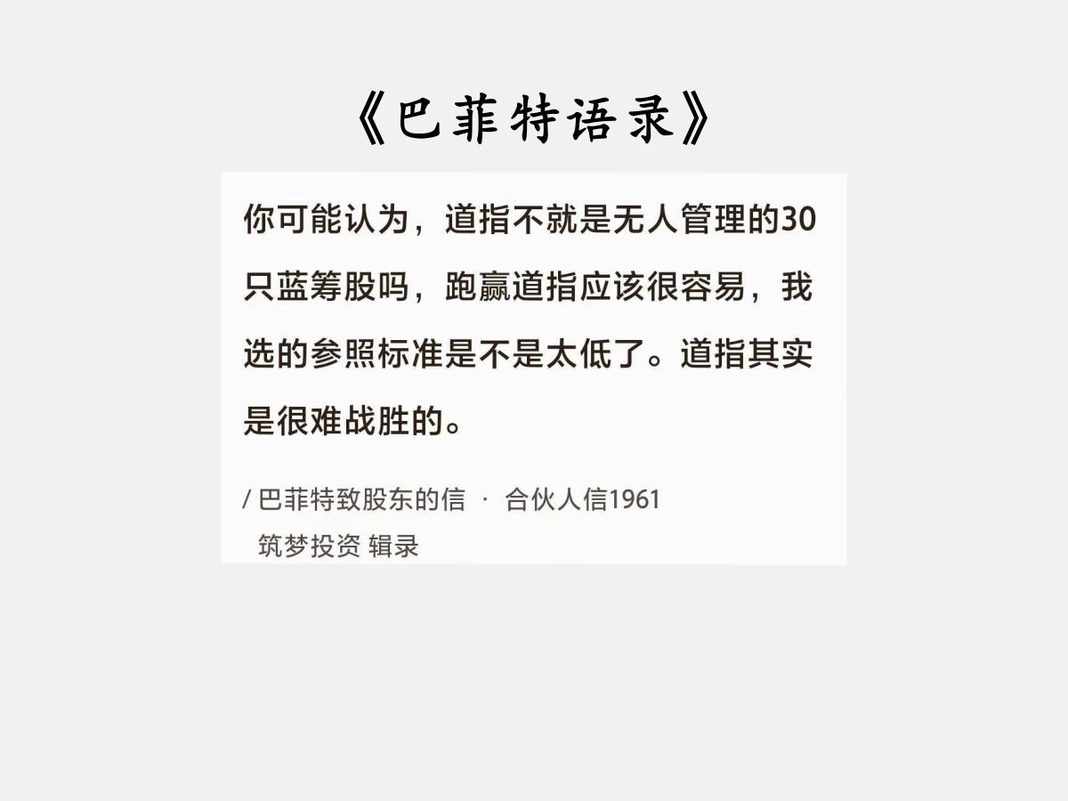 No.037 巴菲特聊“指数很难战胜” 巴菲特曰:“你可能认为,道指不就是无人管理的30 只蓝筹股吗,跑赢道指应该很容易,我选的参照标准是不是太低了。道指其实是很难战胜的。” 股权是最有生命力的资产,而股市是人类顶尖精英的聚集地。能上市的公司都是从千军万马中杀出来的,都是经过市场筛选淘汰过的。 它们能够优胜,杀进资本市场,则是因为人才。越是优质公司,人才数量就越多,含金量越高。 而道指成分股都是优中选优的大型蓝筹股。市值动辄几千几万亿美金,几百亿的都很少。它们能成为各行各业的巨头,是诸多人才携手奋进的结果。 所以,想跑赢道指,就是在与它手底下的精兵强将打擂台,与一批人才精英做竞争,难度可想而知。 并且,指数还有自动更新的机制,能够不断地淘汰落后者,具备造血能力。就像人体细胞新陈代谢,始终保持生机和活力一样。 虽然因样本比较多,道指收益率被平均了,但与存在人性弱点的个人和机构投资者比,跑赢它依然有难度。