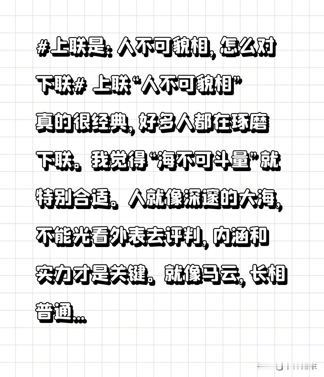 上联“人不可貌相”真的很经典,好多人都在琢磨下联。我觉得“海不可斗量”就特别合适。人就像深邃的大海,不能光看外表去评判,内涵和实力才是关键。就像马云,长相普通,却缔造了商业帝国。所以啊,“人不可貌相,海不可斗量”,大家觉得这对子咋样?
