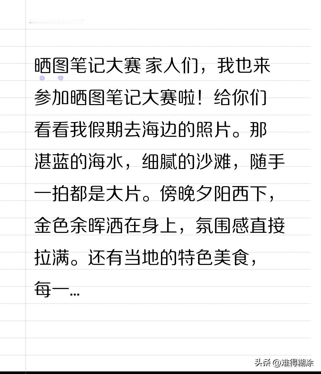 晒图笔记大赛 家人们,我也来参加晒图笔记大赛啦!给你们看看我假期去海边的照片。那湛蓝的海水,细腻的沙滩,随手一拍都是大片。傍晚夕阳西下,金色余晖洒在身上,氛围感直接拉满。还有当地的特色美食,每一口都超满足。这次旅行简直太值,把美好定格在照片里,分享给大家!