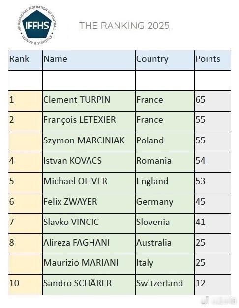 国际足球历史与统计联合会(IFFHS)日前评选出了 2025年度全球最佳裁判,他就是 43 岁的法国著名裁判蒂尔潘。世界最佳裁判前 10 名榜单上还有一位中国足球的老熟人,亚洲裁判法加尼。今年他作为主裁判,执法了今年夏天世俱杯切尔西和大巴黎的冠亚军决赛。 国际足球历史与统计联合会对蒂尔潘的评价是:“克莱门特-蒂尔潘在国际比赛中展现了世界级的裁判水平,表现出了出色的控制力、沉着冷静和精准的站位。”蒂尔潘也不是一名没有争议的裁判,今年 12月11日欧冠皇马对阵曼城的比赛,根据媒体的统计,这是蒂尔潘执法的第一场皇马输球的比赛,说来也巧,此前他执法的皇马比赛战绩为8胜1平。这场比赛他经VAR提醒,判罚吕迪格禁区内抱摔哈兰德,改判点球帮助曼城反超比分。蒂尔潘也是欧冠历史上判罚点球数量最多的主裁判,一共在 58场欧冠中判罚了 31个点球。另外,蒂尔潘和阿森纳队球员特罗萨德确实长得很像。