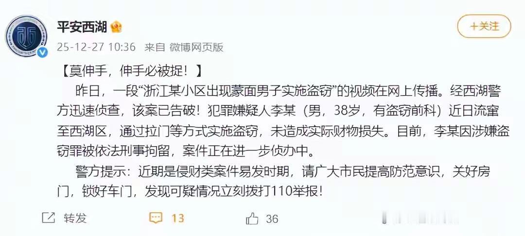 杭州西湖区深夜惊现“蒙面幽灵”扫楼撬锁,数十户居民惊魂未定!警方雷霆出击擒获38岁惯犯,你家门锁真的安全吗? 深夜的小区楼道寂静无声,一个黑影却如鬼魅般游荡。他头戴黑帽、面覆口罩,手持工具,一扇门接着一扇门地试探。这不是电影情节,而是几天前真实发生在杭州西湖区某高档小区的惊魂一幕。监控拍下的画面,让所有看到的人都脊背发凉。 业主陈先生回忆,凌晨时分,一阵细微却刺耳的门锁转动声将他从睡梦中惊醒。他屏住呼吸走到门后,透过猫眼,竟与门外一双窥探的眼睛几乎脸贴脸对上!那一瞬间,恐惧扼住了喉咙。门外那个全副武装的蒙面人,正试图撬开他的家门。 消息在业主群里炸开,恐慌迅速蔓延。经邻居们互相核实,当晚竟有数十户人家的门锁留下了被撬动的痕迹。这个“蒙面幽灵”不仅扫楼撬门,还在车库区域逡巡,挨个拉拽车门,行径嚣张至极。一个原本安宁的家园,瞬间被不安的阴云笼罩。 令人稍感安心的是,得益于一位业主家门口安装的监控清晰记录了嫌疑人的体貌特征,警方接报后迅速行动。通过缜密侦查,西湖警方很快锁定了目标,并将犯罪嫌疑人李某抓获。令人咋舌的是,李某今年38岁,竟是一名有盗窃前科的惯犯。 警方通报称,李某系流窜至西湖区作案,采用拉车门、撬门锁的方式寻找目标,所幸因居民防范意识较强,并未造成实际财物损失。目前,李某因涉嫌盗窃罪已被依法刑事拘留。警方的快速破案,给了受惊的居民一剂及时的定心丸。 然而,案件虽破,留下的思考却远未结束。一个管理严格、有保安值守的高档小区,为何仍被窃贼轻易翻墙潜入?我们依赖的“安全防线”,是否远比想象中脆弱?这起事件赤裸裸地揭示,再好的物业管理和安防设施,也可能存在盲区。 更值得深究的是人心。一个有手有脚、正值壮年的男子,为何屡次选择铤而走险?在移动支付普及、家中少有大量现金的今天,入室盗窃的“收益”与高风险早已不成正比。这背后,或许是好逸恶劳的惯性,或许是扭曲的价值观,更是对社会法律底线的漠视。 对于千家万户而言,此案是一记响亮的警钟。它提醒我们,安全不能完全外包给物业或警方。最简单的“外出、睡前反锁房门”这个动作,就是一道至关重要的自主防线。邻里间的相互守望,发现异常及时沟通报警,也能构筑起强大的社区联防网络。 年底将至,往往是各类侵财案件的高发期。我们无法让罪恶绝迹,但可以让自己变得更谨慎、更强大。从检查自家门锁的等级,到养成离车即锁的习惯,每一个细微的防范动作,都是在向潜在的不法分子宣告:这里,无懈可击。 小区安全 防盗指南 警民同心 (来源:综合自橙柿互动·都市快报、百姓关注、西湖警方通报及网络信息)