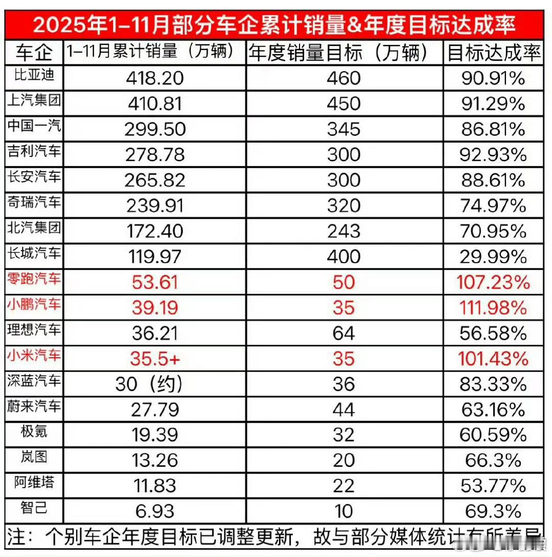 2025年,还有3天就画下句号。截止11月,各大车企年度销量的目标达成率超过90%的有比亚迪、上汽、吉利、零跑、小鹏、小米。还有三天,一汽和长安冲一冲、感觉也能过90%大v聊车