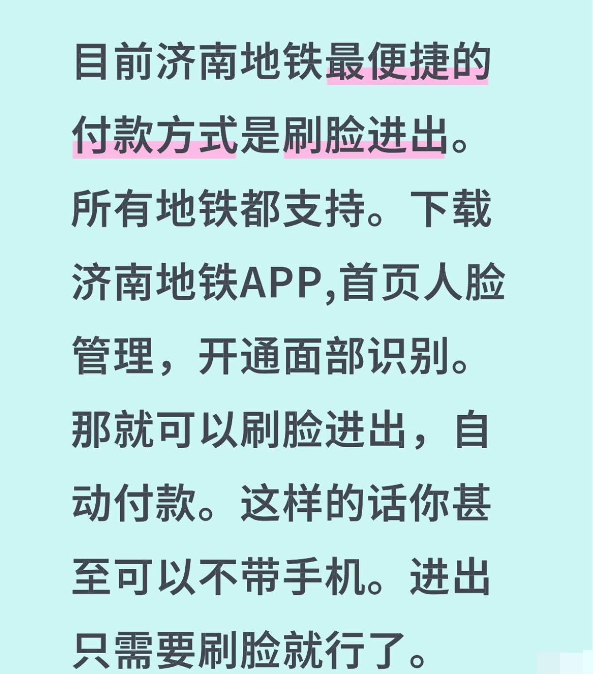 大济南地铁太给力,可以不带手机,靠刷脸付款! 真的是太爽啦,很不错的体验。 就像某些公共场所里自助零售柜一样,取了东西🉑刷脸结账走人。 目前济南地铁均支持这项最便捷的刷脸付款方式。 注意‼️要提前下载济南地铁APP,进行人脸管理设置和开通识别权限,以及自动付款的方式。 然后,你就可以靠脸自由出入啦!