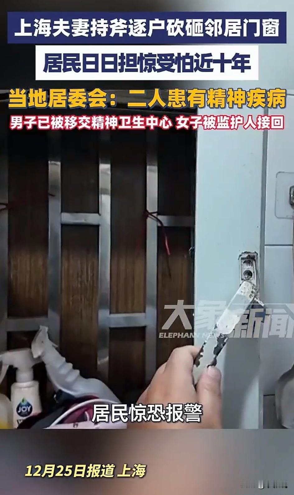 这种事真的能忍十年吗? 邻居是精神病,会用斧子砸门和窗户,居民日日担惊受怕,持续了近十年。 这是邻居太能忍了,还是不得不忍呢? 以前肯定也有报警什么,为什么不能处理? 现在上媒体了,终于处理了。 果然还是需要有曝光才会有处理啊!