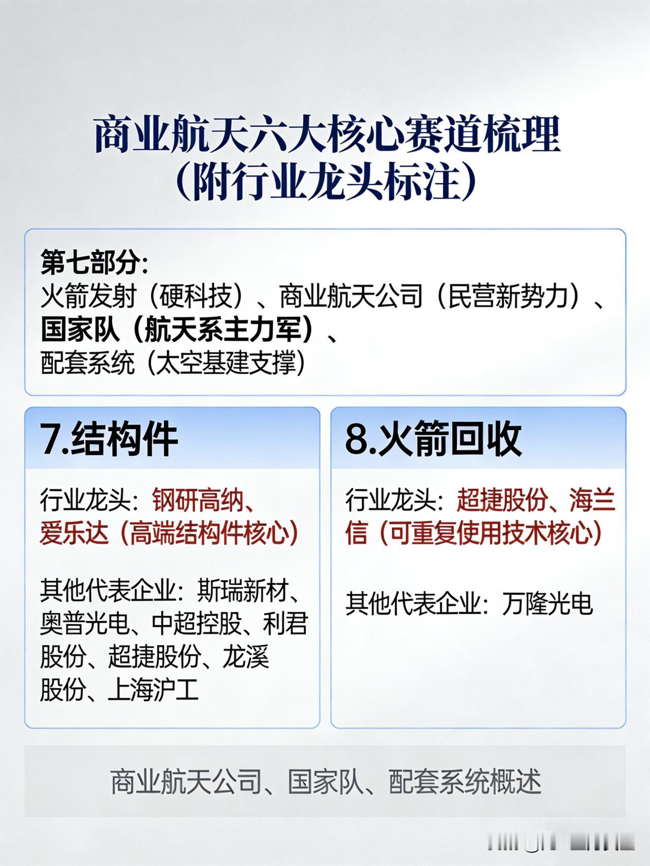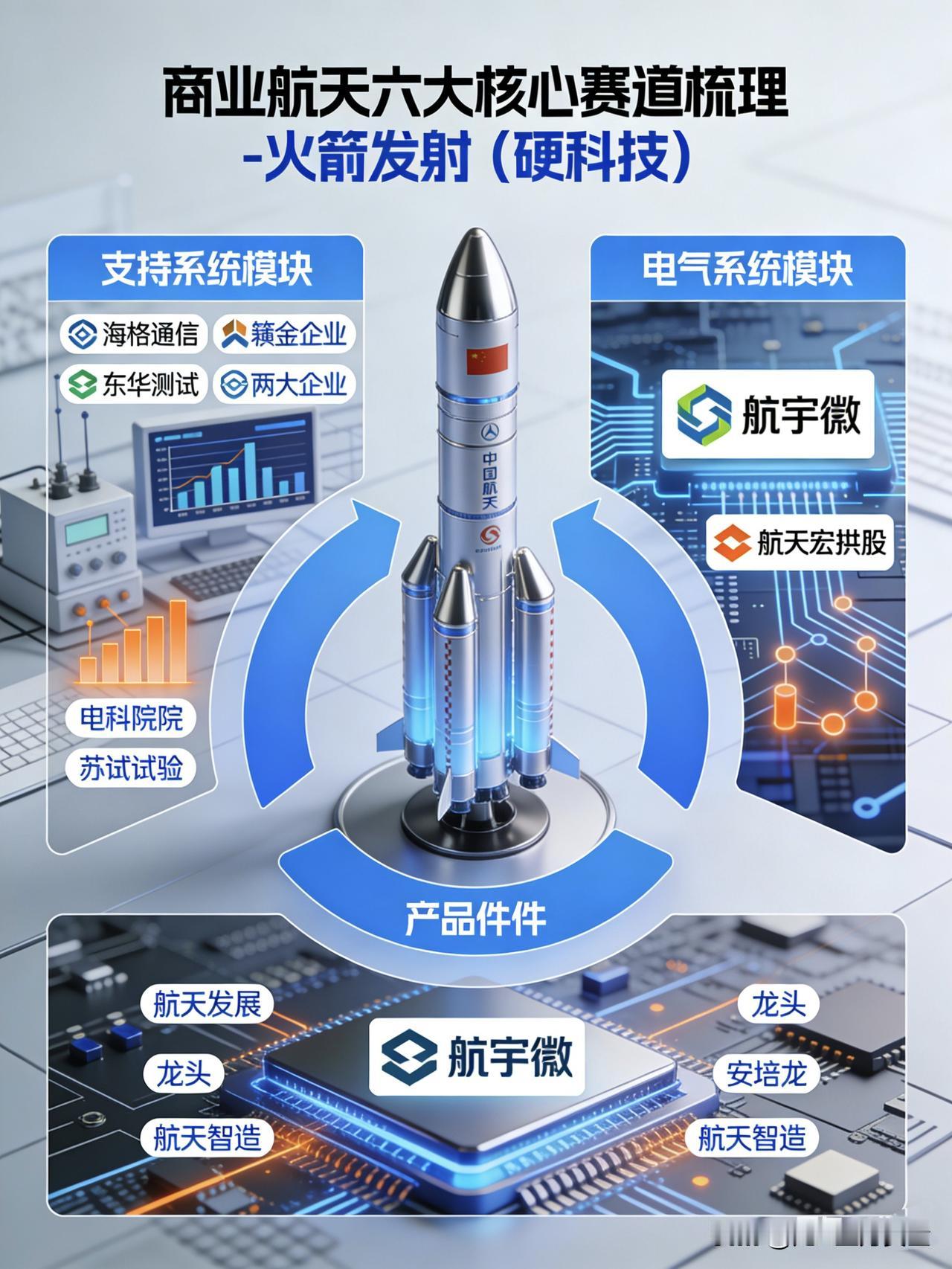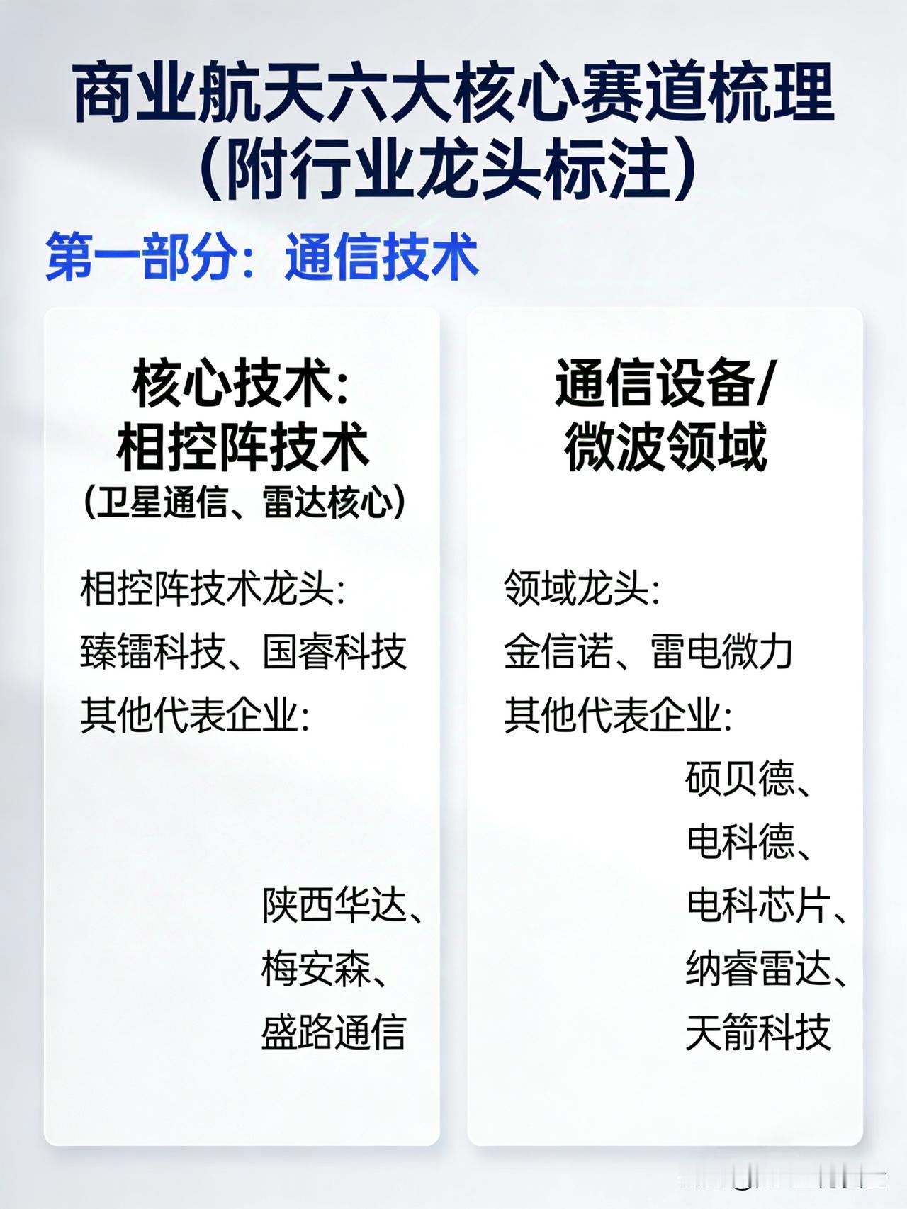 商业航天的6大核心赛道(附代表公司) 一文看懂“太空经济”的底层逻辑 通信技术:相控阵是“技术核心” 相控阵技术:臻镭科技、陕西华达、梅安森、国睿科技、盛路通信(技术壁垒高,用于卫星通信、雷达) 其他:金信诺、雷电微力、硕贝德、电科芯片、纳睿雷达、天箭科技(覆盖微波、通信设备) 卫星相关:从制造到应用的“全链条” 卫星制造:中国卫星、天银机电、上海瀚讯、上海沪工、银河电子(整星设计制造) 零部件:航天晨光、航天电器、国机精工、国力电子、华光新材、隆盛科技、臻镭科技(核心部件供应) 卫星导航:北斗星通、振芯科技、中海达、华测导航、盟升电子(定位、导航、授时) 卫星通信:海格通信、达华智能、海昌新材、烽火通信、灿勤科技(通信终端、系统) 卫星遥感:航天微、航天宏图(遥感数据采集、应用) 卫星测控:西测测试、航天环宇、霍莱沃(地面站、测控系统) 火箭发射:从发动机到回收的“硬科技” 固体发动机:中天火箭、光威复材、新余国科、国科军工(火箭动力核心) 液体发动机:航天动力、九丰能源、斯瑞新材、铂力特、华曙高科(更高效的动力系统) 推进剂:九丰能源(火箭燃料供应) 支持系统:海格通信、电科院、东华测试、苏试试验、航天电子、七一二、福光股份、新光光电(测试、配套设备) 电气系统:航宇微、航天宏图(电气控制) 元器件:航天发展、安培龙、航宇微、航天智造、灿勤科技(芯片、电子元件) 结构件:爱乐达、钢研高纳、斯瑞新材、奥普光电、中超控股、利君股份、超捷股份、龙溪股份、上海沪工(火箭结构件) 火箭回收:万隆光电、超捷股份、海兰信(可重复使用技术) 商业航天公司:民营“新势力”崛起 蓝箭航天:金风科技、荣盛发展、斯瑞新材、鲁信创投、张江高科(投资方+产业链合作) 中科宇航:高华科技、豪能股份、斯瑞新材(技术合作+供应链) paceX:超捷股份、通宇通讯、西部材料、信维通信(供应链企业) 天兵科技:海翔药业、中国卫星、中天火箭(合作+投资) 国家队:航天系“主力军” 航天科工:航天发展、航天长峰、航天科技、航天电器(央企背景,技术底蕴深厚) 航天科技:航天工程、中国卫星、航天动力、航天智造、航天电子(卫星、火箭核心企业) 配套系统:支撑“太空基建”的幕后英雄 管理系统:佳缘科技(信息化管理) 制造材料:润贝航科、通光线缆、华菱线缆(高端材料供应) 相关部件:宗申动力、国机精工、三角防务、飞沃科技、天成自控(零部件、设备)
