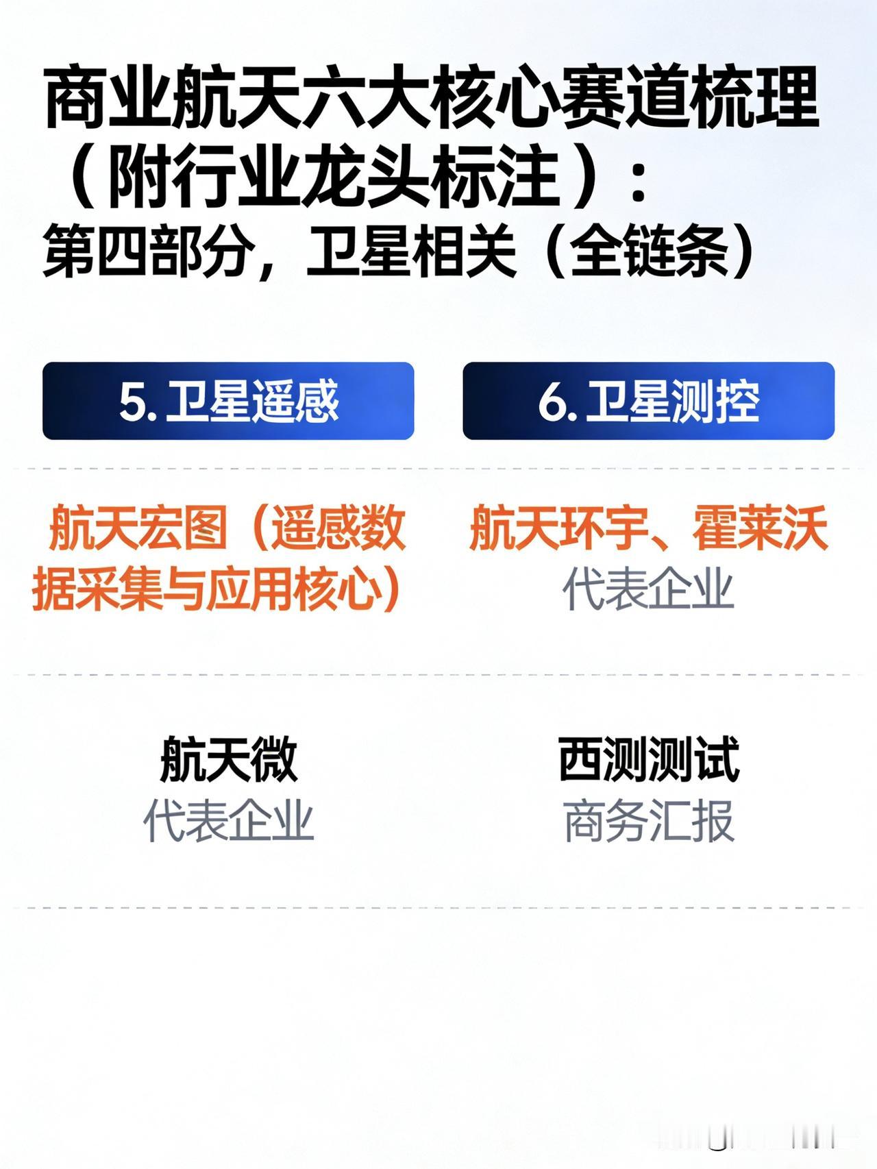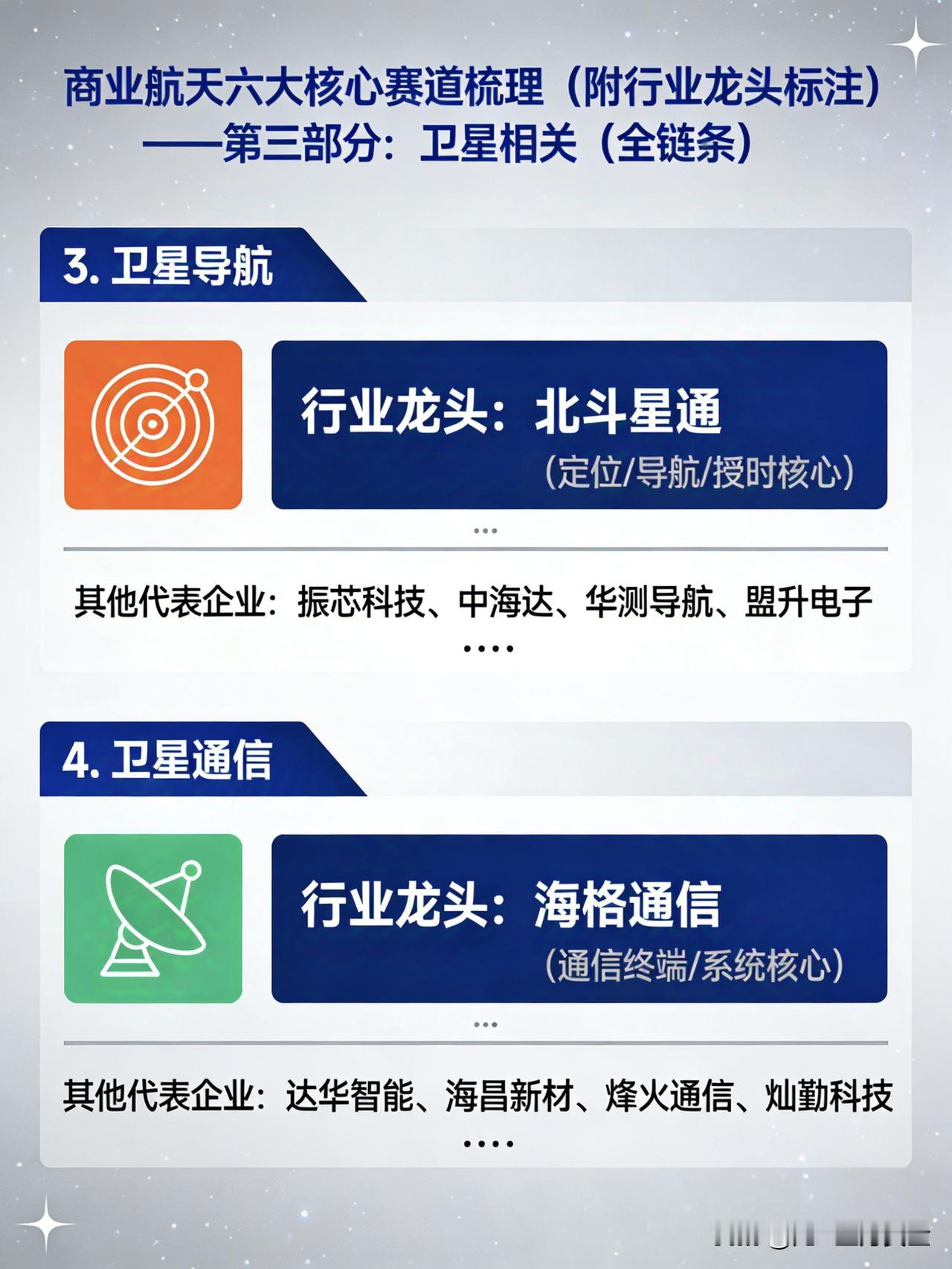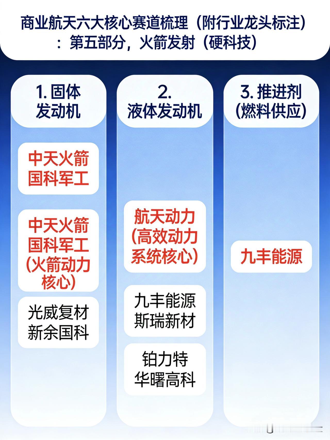 商业航天的6大核心赛道(附代表公司) 一文看懂“太空经济”的底层逻辑 通信技术:相控阵是“技术核心” 相控阵技术:臻镭科技、陕西华达、梅安森、国睿科技、盛路通信(技术壁垒高,用于卫星通信、雷达) 其他:金信诺、雷电微力、硕贝德、电科芯片、纳睿雷达、天箭科技(覆盖微波、通信设备) 卫星相关:从制造到应用的“全链条” 卫星制造:中国卫星、天银机电、上海瀚讯、上海沪工、银河电子(整星设计制造) 零部件:航天晨光、航天电器、国机精工、国力电子、华光新材、隆盛科技、臻镭科技(核心部件供应) 卫星导航:北斗星通、振芯科技、中海达、华测导航、盟升电子(定位、导航、授时) 卫星通信:海格通信、达华智能、海昌新材、烽火通信、灿勤科技(通信终端、系统) 卫星遥感:航天微、航天宏图(遥感数据采集、应用) 卫星测控:西测测试、航天环宇、霍莱沃(地面站、测控系统) 火箭发射:从发动机到回收的“硬科技” 固体发动机:中天火箭、光威复材、新余国科、国科军工(火箭动力核心) 液体发动机:航天动力、九丰能源、斯瑞新材、铂力特、华曙高科(更高效的动力系统) 推进剂:九丰能源(火箭燃料供应) 支持系统:海格通信、电科院、东华测试、苏试试验、航天电子、七一二、福光股份、新光光电(测试、配套设备) 电气系统:航宇微、航天宏图(电气控制) 元器件:航天发展、安培龙、航宇微、航天智造、灿勤科技(芯片、电子元件) 结构件:爱乐达、钢研高纳、斯瑞新材、奥普光电、中超控股、利君股份、超捷股份、龙溪股份、上海沪工(火箭结构件) 火箭回收:万隆光电、超捷股份、海兰信(可重复使用技术) 商业航天公司:民营“新势力”崛起 蓝箭航天:金风科技、荣盛发展、斯瑞新材、鲁信创投、张江高科(投资方+产业链合作) 中科宇航:高华科技、豪能股份、斯瑞新材(技术合作+供应链) paceX:超捷股份、通宇通讯、西部材料、信维通信(供应链企业) 天兵科技:海翔药业、中国卫星、中天火箭(合作+投资) 国家队:航天系“主力军” 航天科工:航天发展、航天长峰、航天科技、航天电器(央企背景,技术底蕴深厚) 航天科技:航天工程、中国卫星、航天动力、航天智造、航天电子(卫星、火箭核心企业) 配套系统:支撑“太空基建”的幕后英雄 管理系统:佳缘科技(信息化管理) 制造材料:润贝航科、通光线缆、华菱线缆(高端材料供应) 相关部件:宗申动力、国机精工、三角防务、飞沃科技、天成自控(零部件、设备)
