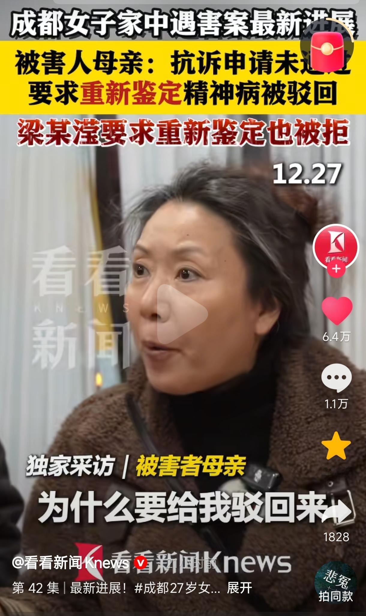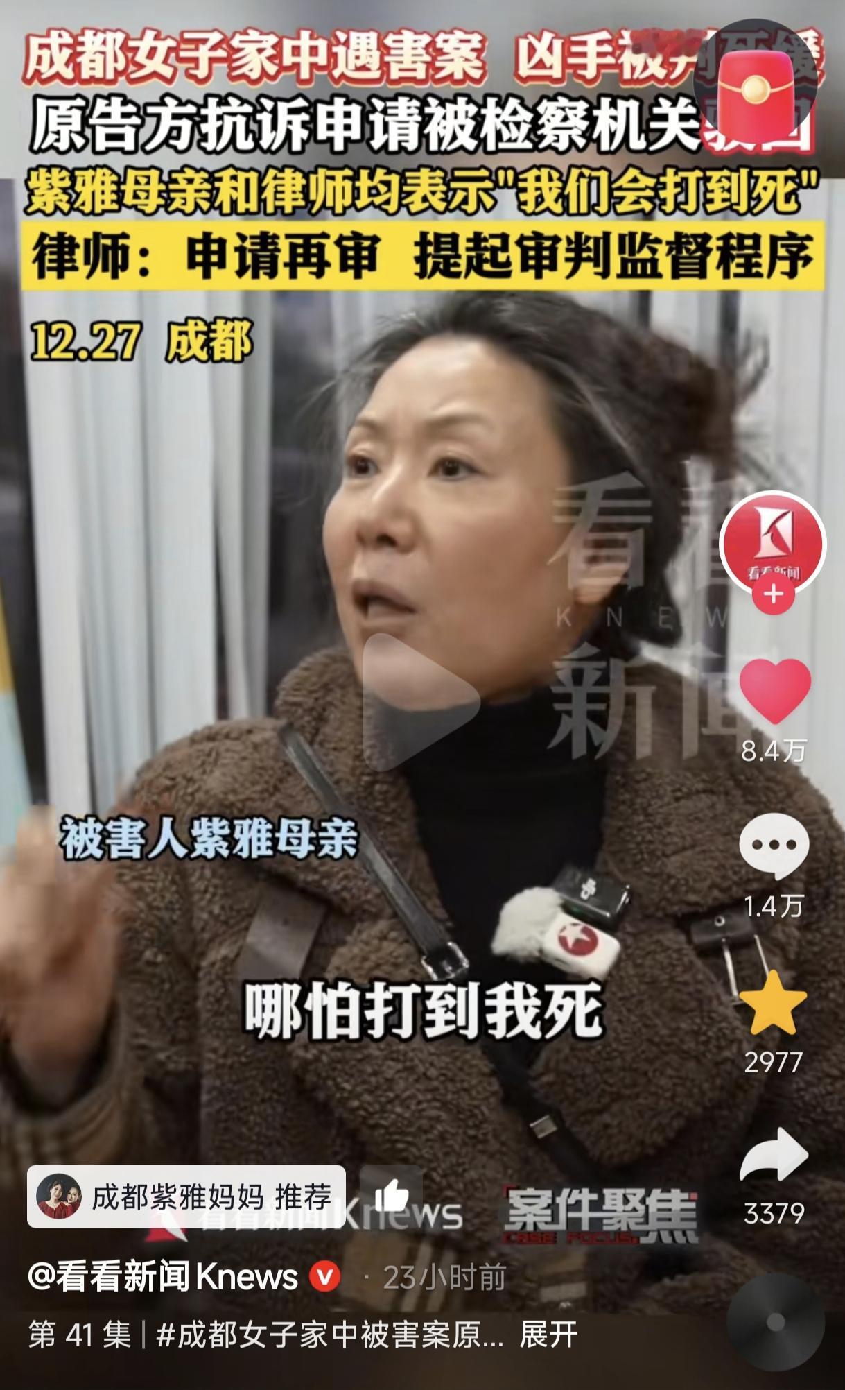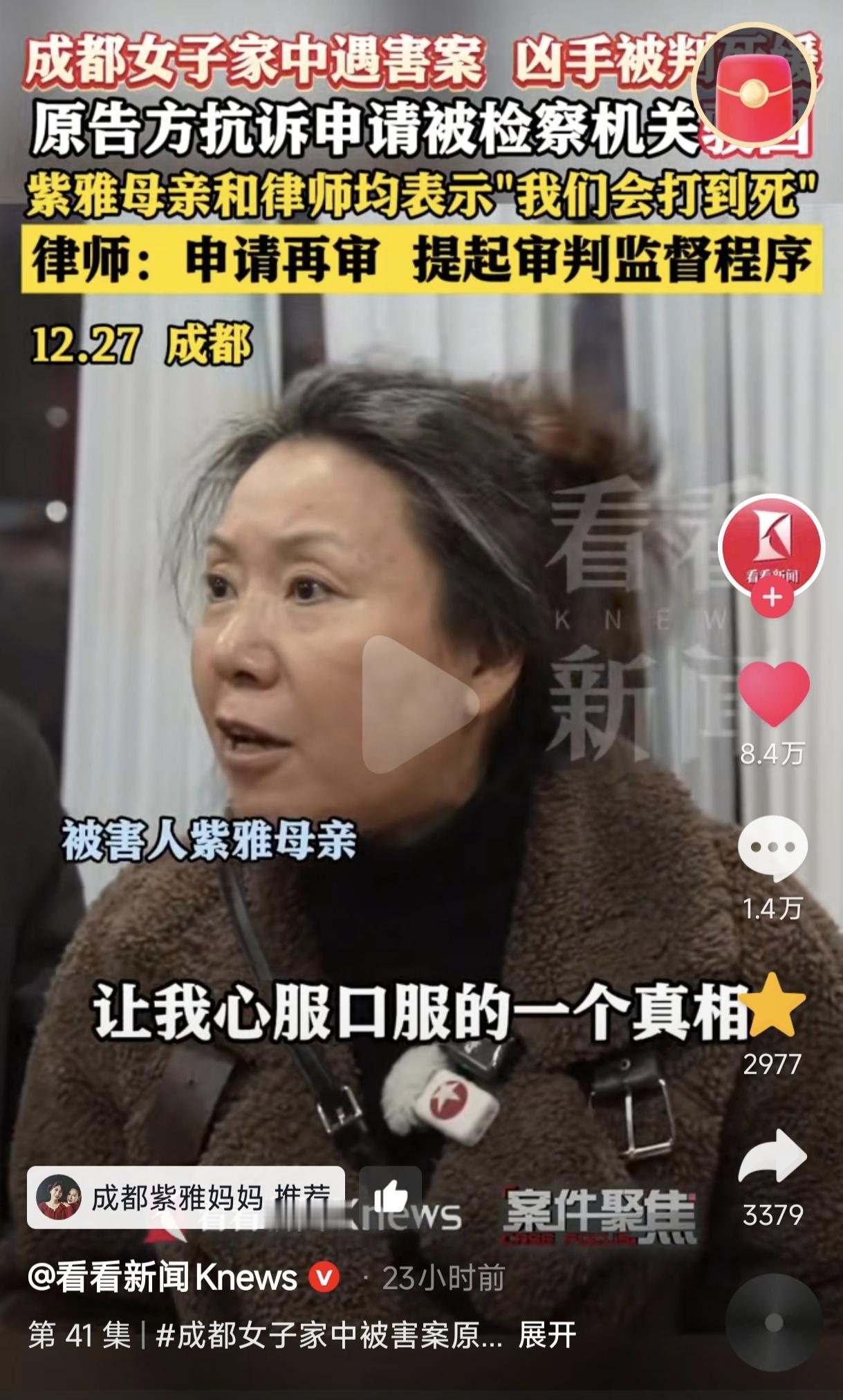 太心疼紫雅妈妈了,抗诉申请没成功,要求重新鉴定精神病又被驳回,她只是一位为女儿讨公道的母亲,为何道路如此艰难?但也不能小看母亲的力量,紫雅妈妈与律师均表示“我们会打到死!” 太不可思议了,按说作为被害人的母亲,紫雅妈妈有权利提起二次鉴定,女儿惨死冤死母亲要一个真相这么难吗,为什么就不给这个机会呢?有意思的是,被告梁柯莹也提了鉴定,照样被驳回了。 虽然二审维持原判的可能性大,但不是没有抗诉成功的案例。如2023年广西男子改装射钉枪射死邻居夫妇一案,据说也是因凶手作案时处于精神分裂发病期一审被判死缓两年,后市检察院向高院提起刑事抗诉,12月17日凶手被改判为死刑立即执行。 这就是“死缓改判死刑”的典型案例,感觉与紫雅案很相似,如果照紫雅妈妈要打到高院的说法,说不定紫雅案也会出现这种结果,希望紫雅妈妈坚持到底。 不知怎的,总感觉紫雅一案让人意难平,最让人匪夷所思的还是精神鉴定报告,一是只花两个半小时面检做出的结果,且两名鉴定人未面见仅复核签字,二是重新提起鉴定又被驳回。 显然司法这是认定了鉴定资质的合规合法性,即便两名鉴定人未面见仅复核签字也只是格式瑕疵。因此只有紫雅妈妈拿出足以推翻此鉴定的硬核医学证据,抗诉才可能成功。 但紫雅妈妈表示往后余生每一天都要死嗑这事一直打到死,这是一位母亲的绝望孤勇,更是公众对“精神病免死”的意难平! 你很难想象一位含辛茹苦将女儿抚养长大培养得那么优秀的单身母亲的强大力量,一个60岁老人宁肯放弃百万赔偿也要在550多天里化悲痛为坚毅只为给女儿讨回一个公道。 对此,我们不得不提出质疑~ 首先,精神病鉴定真是“免死金牌”吗?两个半小时面检就做出的精神鉴定报告,司法采信是否太草率? 其次,梁柯莹手段残忍S害邻居且毫无悔意,家属还放任不管,闯下弥天大祸为啥要受害者埋单? 再有,法律维护公平正义,但正义不应让弱者死嗑,如果一位母亲要打到死才可能接近公道,那么司法的公信力何在? 紫雅妈妈表示打到死,是一位母亲能给予女儿的最后的铠甲。若“有病”就能轻纵恶行,那谁来为无辜逝去的生命兜底?