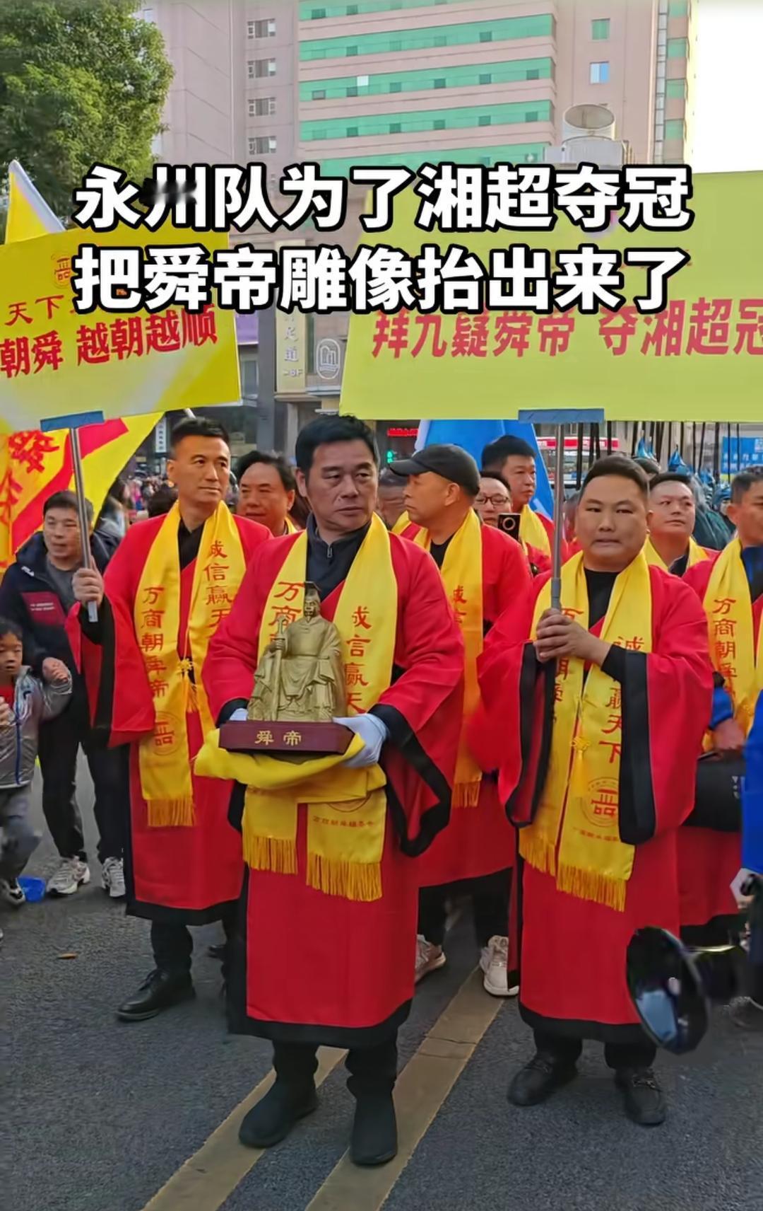 哈哈,永州人为了永州夺冠也是拼了,昨天湘超决赛,永州球迷搞了一个大阵仗,直接把“舜帝”从永州请到长沙,有“炎帝”的株洲已经被常德给淘汰了,没有了“炎帝”作为对手,“舜帝”果然是厉害,让永州人如愿以偿夺冠了,永州人昨天就开始提前过年了。 舜帝陵是中国有记载的始祖陵中最古的陵,在《尚书》《山海经》《史记》等五十多部史书都有舜帝驾崩苍梧之野长眠于九嶷山的记载,九嶷山位于湖南省永州市宁远县九嶷山瑶族乡。不知道在永州夺冠之后,永州球迷们会不会去九嶷山去感谢一下舜帝。