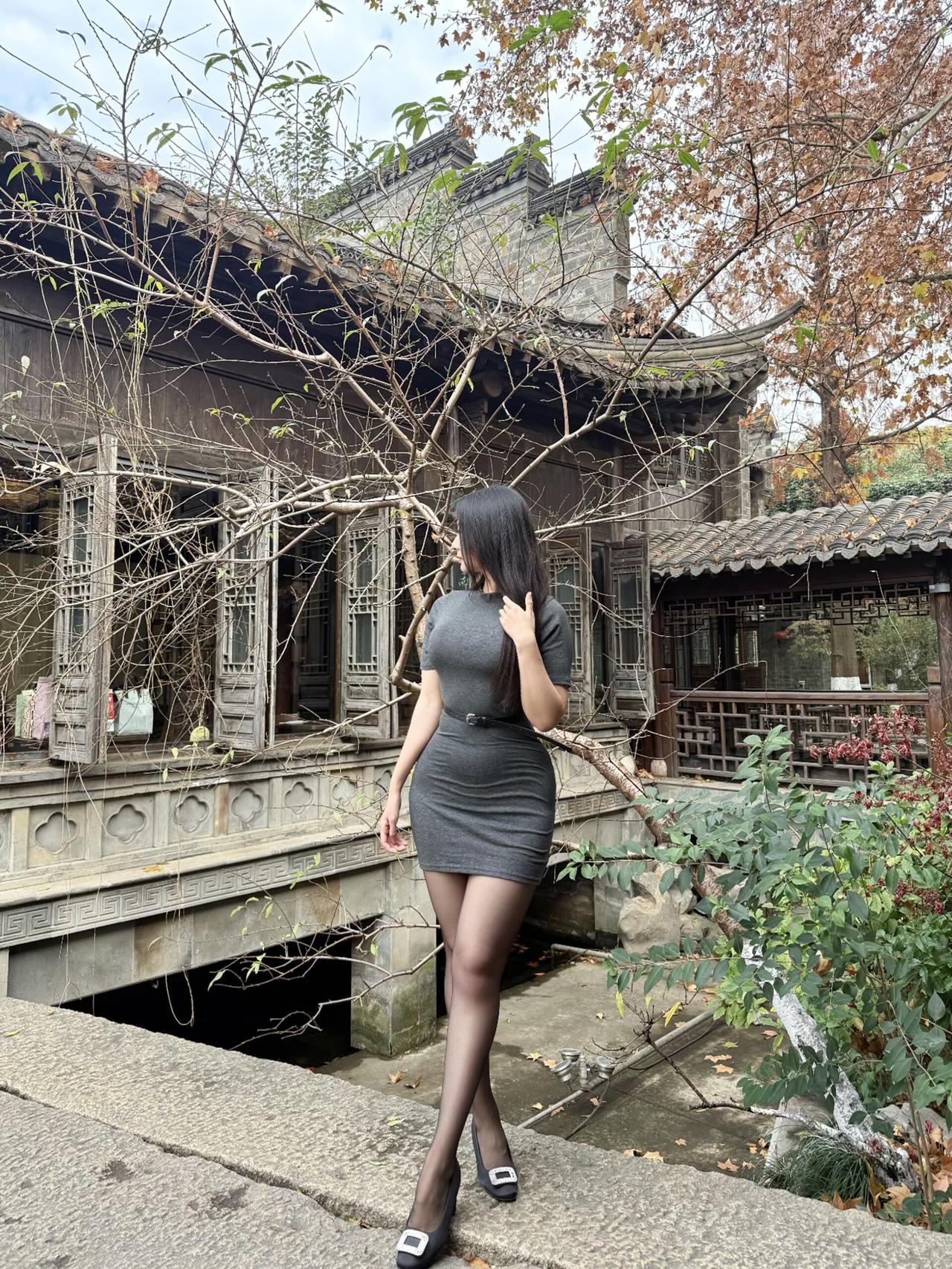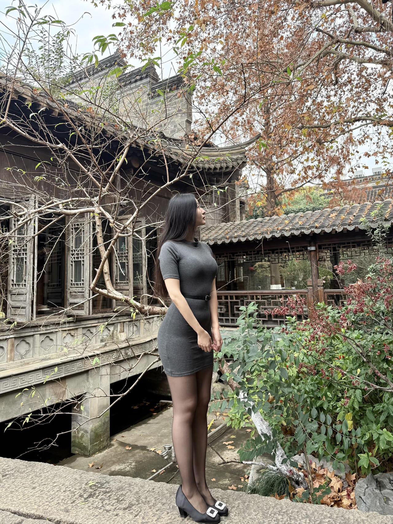 你以为的秋,是落叶的告别? 其实,它是所有生命在时光里,最热烈的自我介绍。 灰裙裹住秋的轮廓时,我才发现,古典园林的木栏不是“背景”,是岁月搭好的舞台: 木纹里的裂痕,是时光的皱纹;瓦当下的风,是百年前的呼吸。 我坐在廊沿,指尖划过木栏的凉,像触到时光的骨节。 枯枝探进画面,不争不抢,却把秋的萧瑟撕开一道口子。 你看,所有“残缺”都在提醒我们:生命从不需要完美,只需要在时光里,留下自己的形状。 转身望向院落,灰裙贴着秋风晃,黑丝裹着小腿的暖。 这一刻,我突然懂了秋叶的红: 它不是为了凋零而燃烧,是为了在坠落前,把最后一簇火,递给每一个路过的人。 就像我站在这片天地里,脚下的青砖冰凉,心头的热却在涨。 我们总说“秋日薄暮”,可当你把自己交给秋,它会还你一腔滚烫: 哪怕时光会斑驳木栏、吹黄树叶,却永远偷不走,你藏在裙摆里的倔强,和眼眸里不肯熄灭的光。 愿你在这个每一季秋天里,都能做一簇不肯熄灭的火。 哪怕世界催着落叶,你依然能用自己的温度,把这斑驳的时光,过成自己的模样。