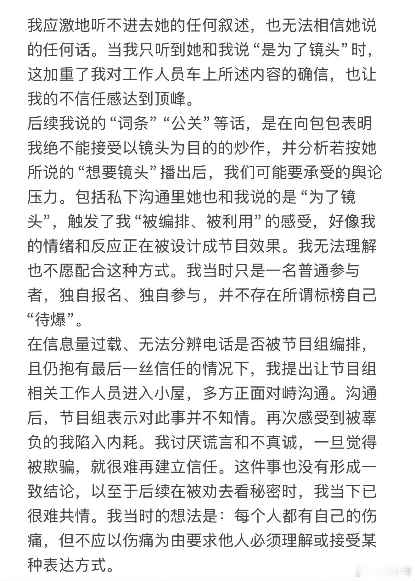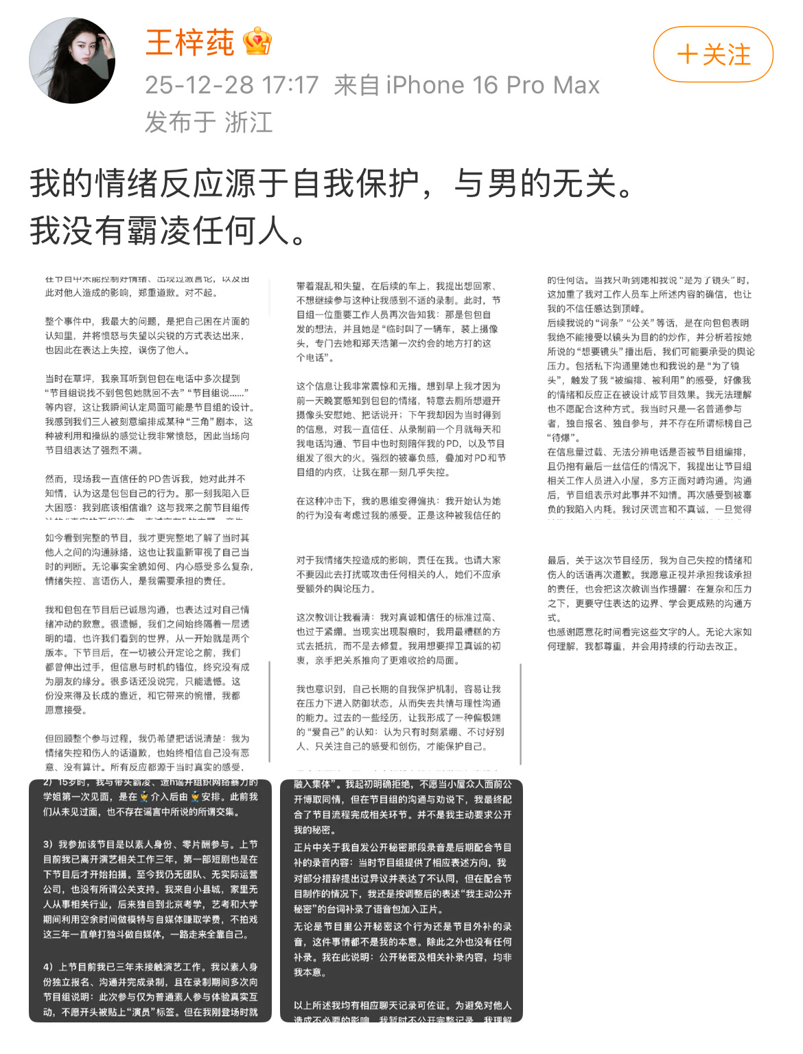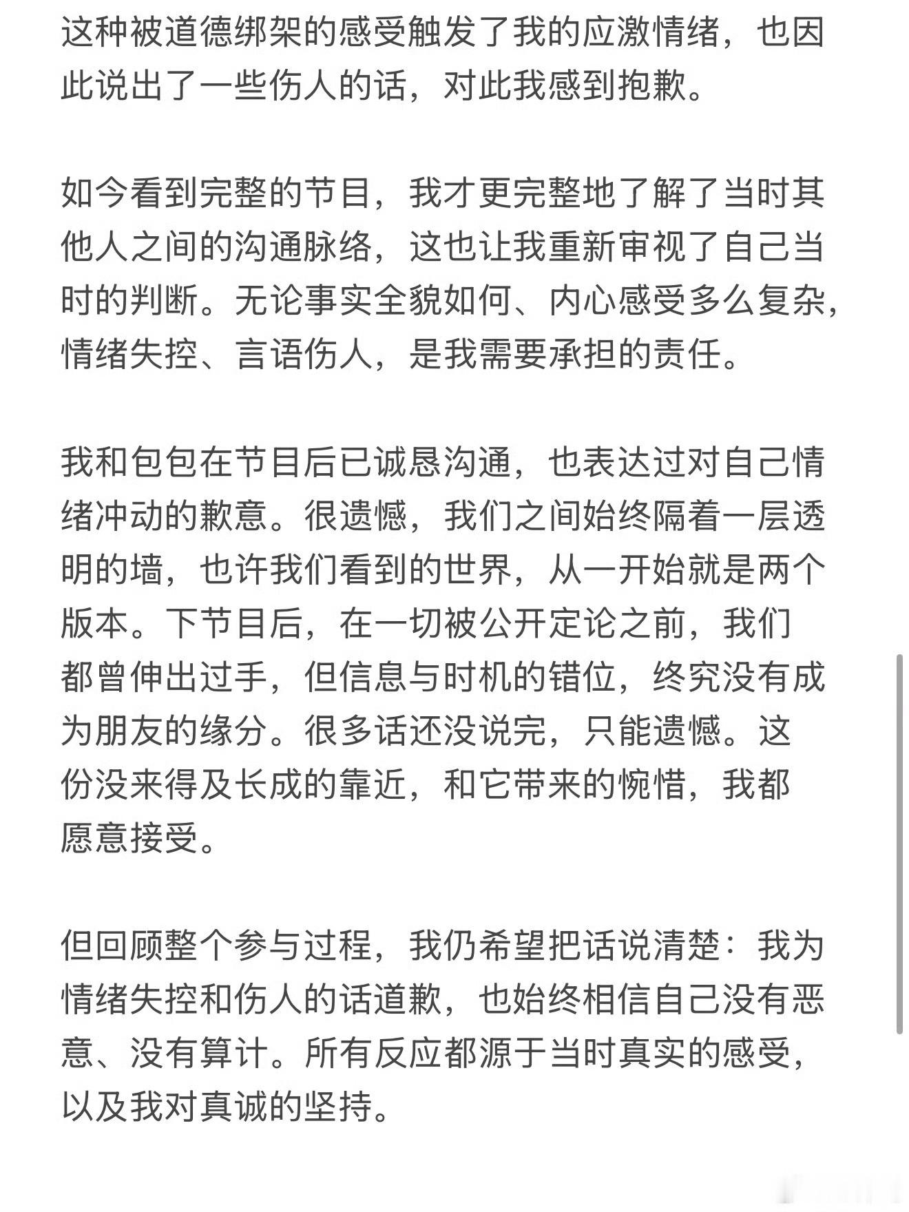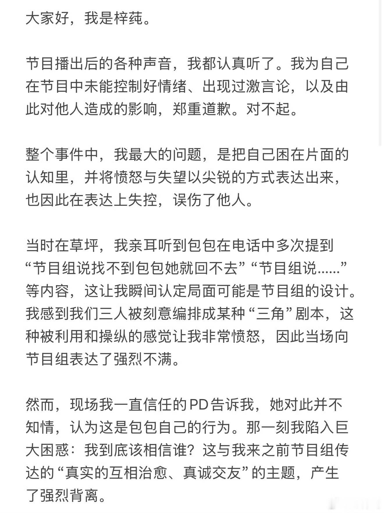王梓莼发博 王梓莼发博回应前段时间的争议:1️⃣录制节目中因为信息差理解成节目组想要制造“三角关系”,但PD告诉王梓莼是包包的个人行为,让她感觉到背叛,才有了秘密小屋的情节。2️⃣节目后看了完整视频才得知事情原委,和宝宝私下道歉了。3️⃣没有参与过霸凌。4️⃣在录制节目前已经三年没拍戏了,录制时也跟导演组强调不想过分强调“演员”这个身份,是以“素人”身份参与录制。开头就播出的“小龙女”片段是节目组的主张。5️⃣“公开秘密”片段是节目组沟通录制的,不是王梓莼本人意愿。 王梓莼称没有霸凌任何人