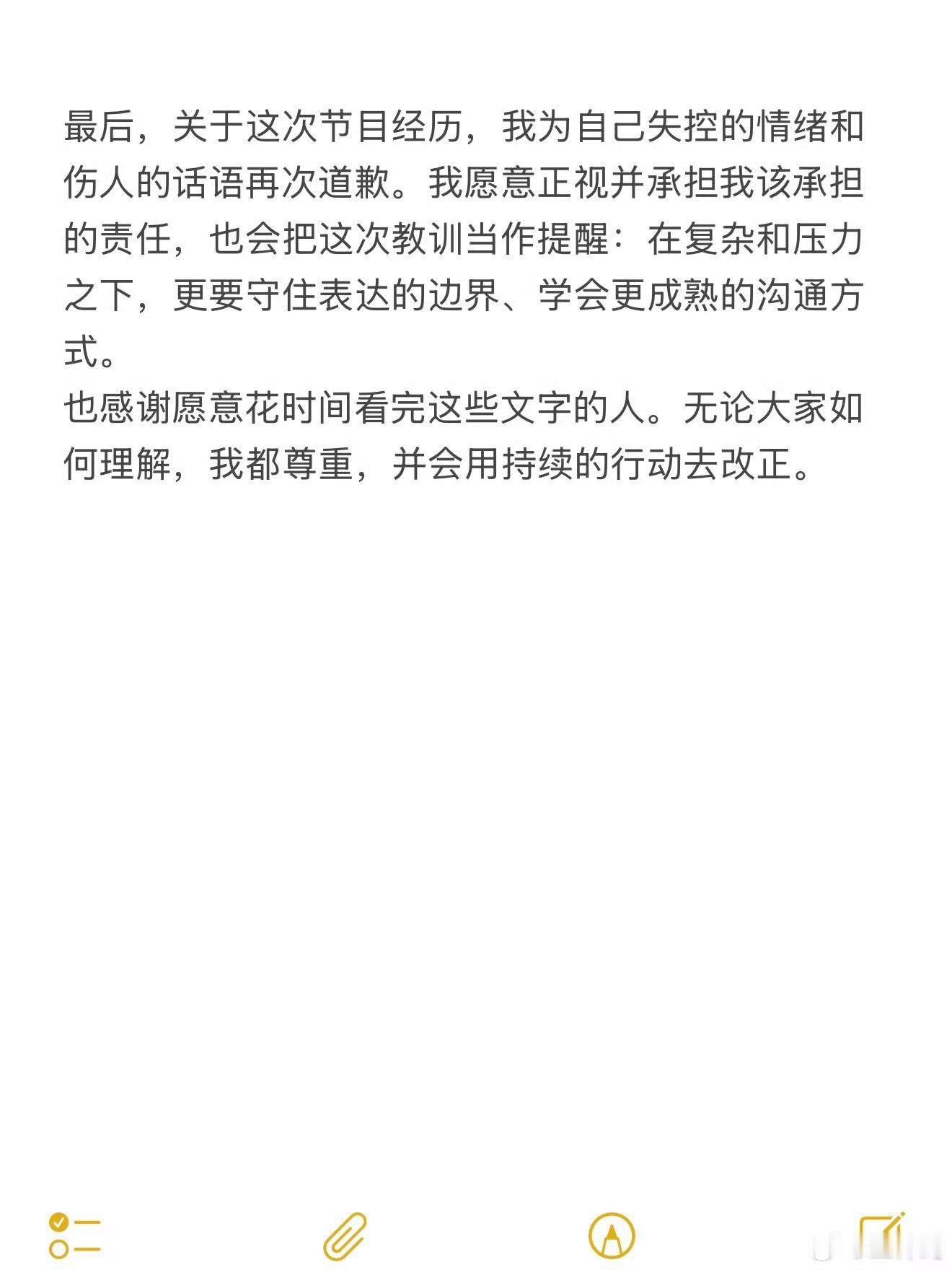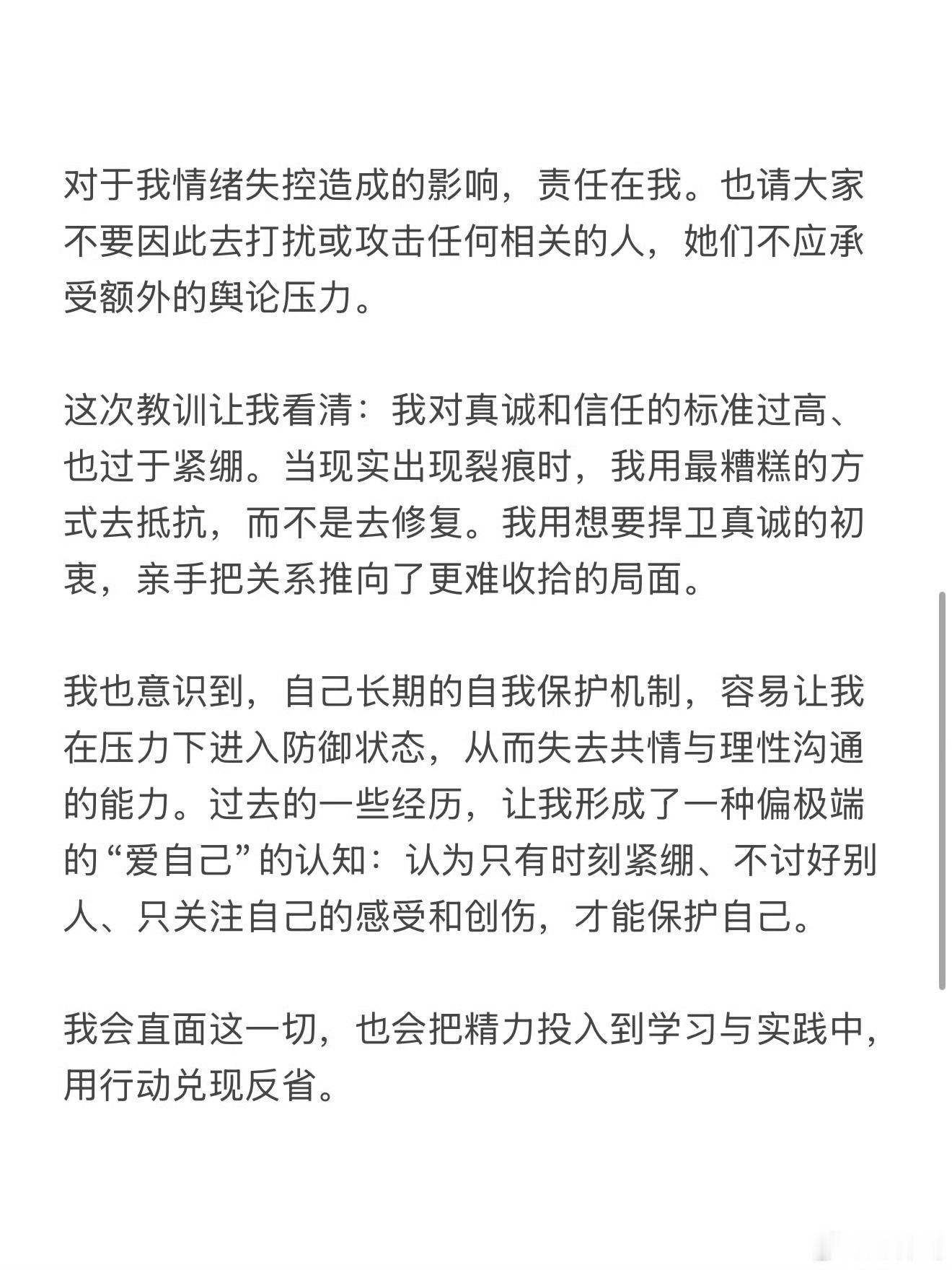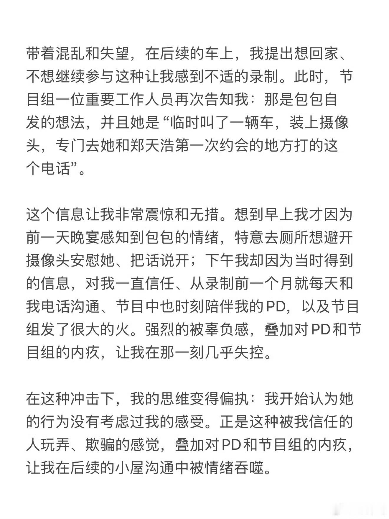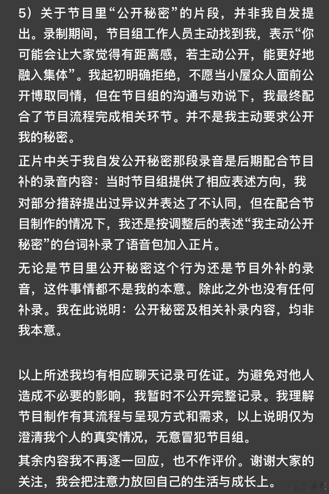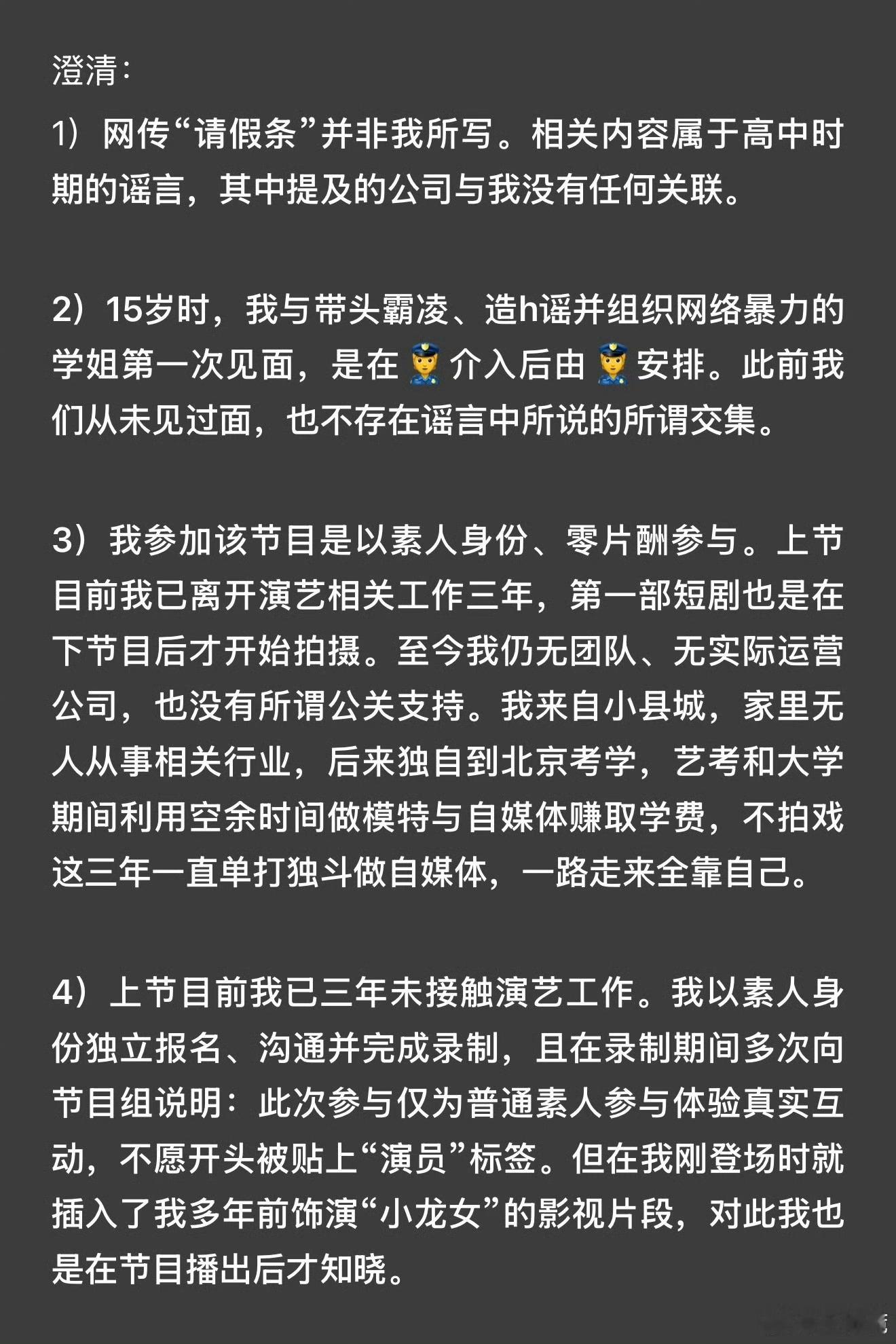 王梓莼发博 王梓莼发博回应前段时间的争议:1️⃣录制节目中因为信息差理解成节目组想要制造“三角关系”,但PD告诉王梓莼是包包的个人行为,让她感觉到背叛,才有了秘密小屋的情节。2️⃣节目后看了完整视频才得知事情原委,和宝宝私下道歉了。3️⃣没有参与过霸凌。4️⃣在录制节目前已经三年没拍戏了,录制时也跟导演组强调不想过分强调“演员”这个身份,是以“素人”身份参与录制。开头就播出的“小龙女”片段是节目组的主张。5️⃣“公开秘密”片段是节目组沟通录制的,不是王梓莼本人意愿。 王梓莼称没有霸凌任何人