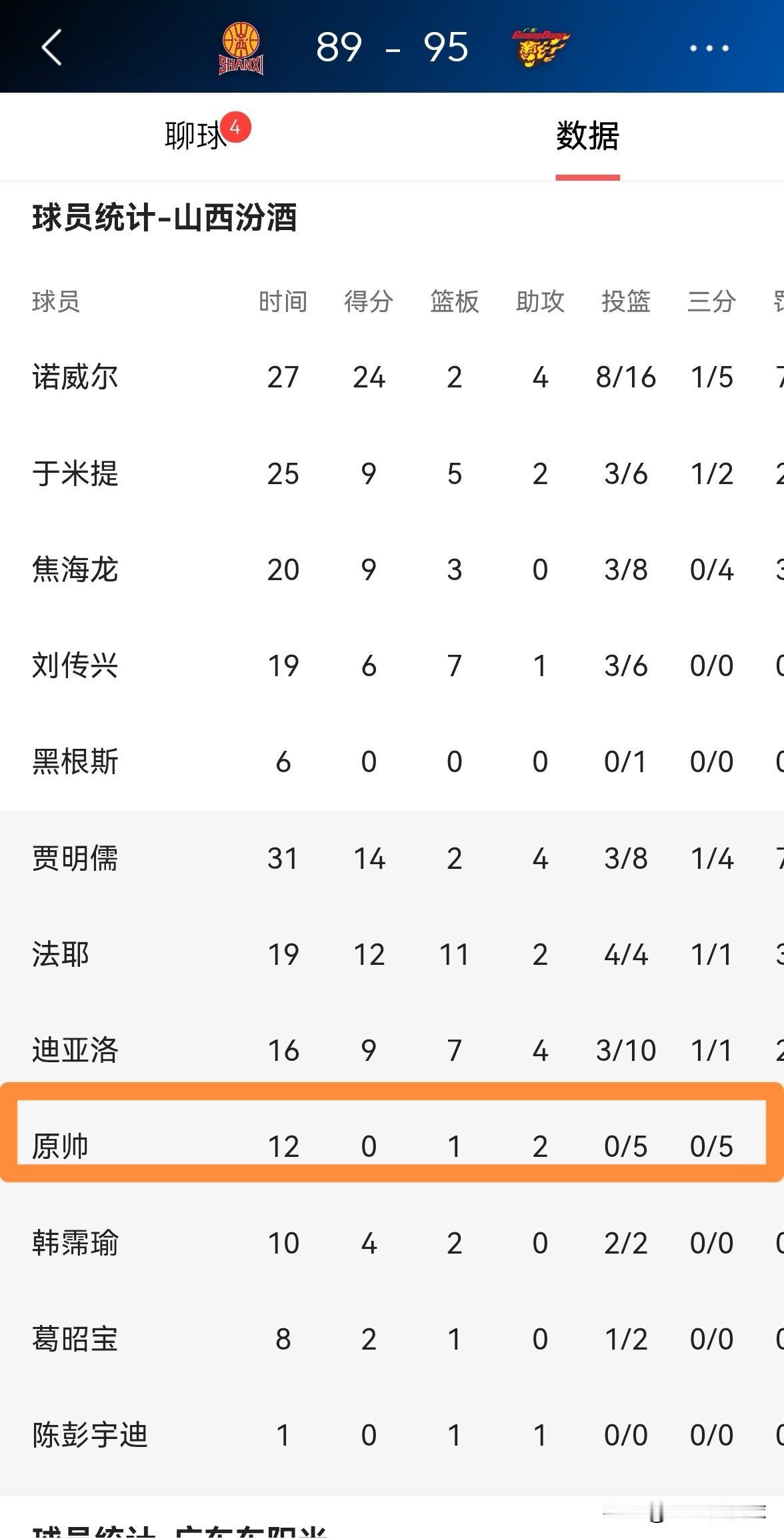 山西汾酒大将原帅绝对是一个冒牌的神射手!在今天山西汾酒主场以89:95输给广东东阳光的比赛中,原帅的手感非常冰凉,他在替补出战的12分钟里,三分球5中0怒砍0分,还有4次犯规,他的场上正负值为-8。 作为当今CBA最强三分射手之一,今天的原帅绝对是一个冒牌货。