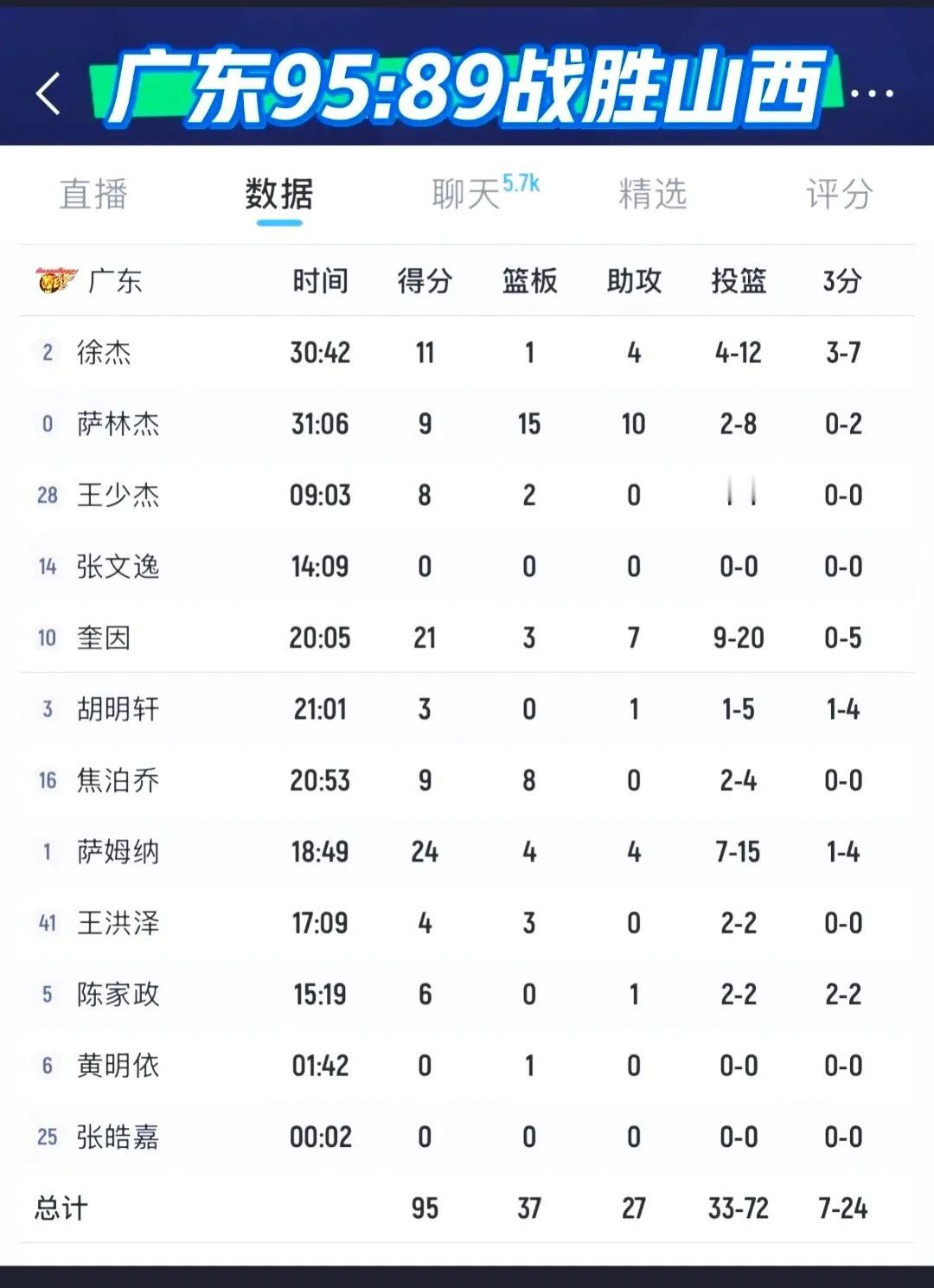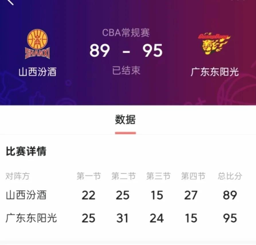 广东客场95-89击败击败击败山西! 现在看广东队打山西,都有点心惊胆跳感觉,山西队很强吗?太抬举它们了,上赛季昙花一现而已。是这个球队现在打的太脏了,特别是那个叫迪亚诺的,就怕一场比赛打下来,我们的球员伤痕累累。 看到迪亚诺对陈家政使毒招,气的热血沸腾,如果屏幕能是时空隧道,会立马穿越去,教训这物一顿,真是把球迷气愤的啊。 回到比赛本身,广东队是什么球队来着?是王者之师仁义之师,不是小小的山西队能比的。 话说第三节打完广东队领先18分,第四节打得非常不好,最后才赢6分,杜锋回去应该好好反思总结。 焦泊乔这场比赛开始回暖,打的不错,希望接下来放下包袱,相信自己。 好了,赢了就好,特别是赢山西队。