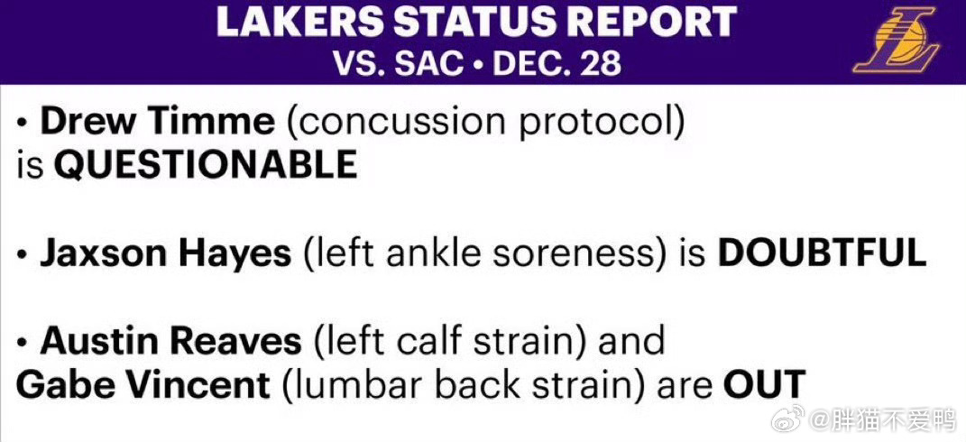 湖人国王伤病名单来了!文森特又缺席!国王伤病名单有点多啊!首先湖人这边——蒂米(脑震荡协议观察)明日出战成疑!海斯(左踝酸痛)明日小概率出战!里夫斯(左小腿拉伤)、文森特(腰椎背部拉伤)继续缺阵!国王这边——萨博尼斯(膝盖半月板)明日缺席!拉文(脚踝扭伤)明日缺席!卡特(脚踝扭伤)明日缺席!穆雷(小腿拉伤)出战成疑!尤班克斯(手指撕裂)明日缺席!湖人这边里弗斯在上一场打火箭紧急复出后,只打了两节就伤退了,此次受伤大概要缺席至少4周!而里弗斯或因此伤错过生涯首次全明星比赛!毕竟按照他本赛季的比赛大概率要入选全明星的!文森特又缺席?目前已经连续缺席4场了,我已经对他无话可讲了!本想着里夫斯缺席,他的机会会多一点,也只有他能扛起一点火力,他现在在我心中的地位还不如可乐杯!而湖人目前确实伤病远不止这三人,东契奇,老詹,八村,艾顿,斯玛特等人都有伤在身,特别是斯玛特上一场打火箭肩膀脱臼去更衣室后,还能回来打,不愧绿军队魂!而东契奇其实也一直带伤作战,状态也是真不好!国王这边伤病情况有点多,穆雷明天不知道能不能打,他的三分火力贼猛,而小萨,拉文,卡特等人继续缺席!明天就看威少跟德罗赞势能不能为上一场失利而复仇了!威少这几年打湖人都贼猛了,今天威少三分9投5中,生涯末年投出三分来了!少爷是真牛!洛杉矶湖人队里夫斯小腿二级拉伤拉塞尔-威斯布鲁克威斯布鲁克湖人国度