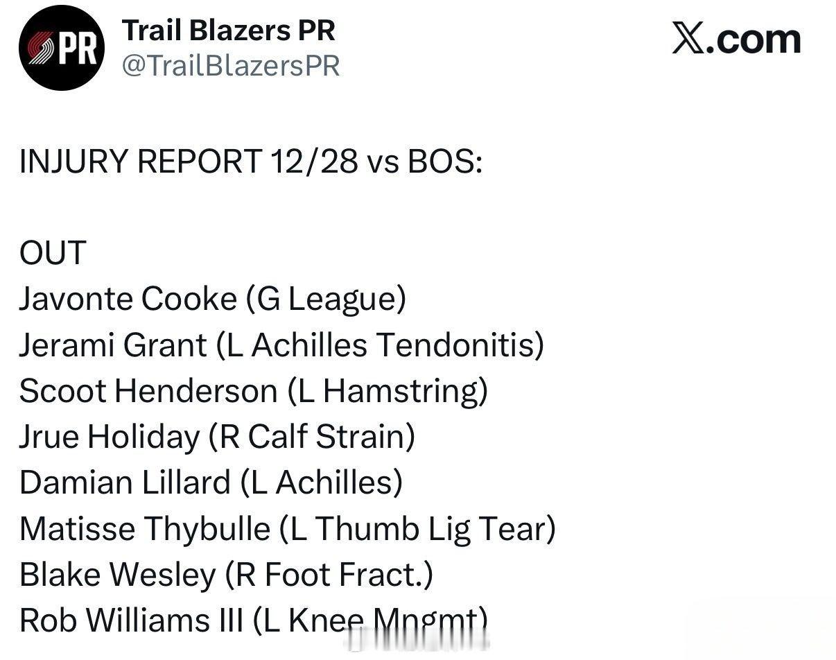 凯尔特人vs开拓者 开拓者更新明早七点对阵凯尔特人伤病名单:格兰特和罗威确认缺席比赛。瀚森预计将会获得更多出场时间,希望明天教练能多给机会展示。凯尔特人vs开拓者波特兰开拓者杨瀚森波特兰开拓者超话 cba超话大赏波特兰开拓者杨瀚森NBA