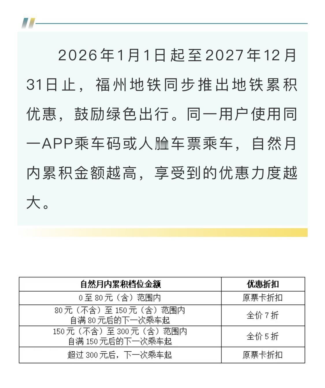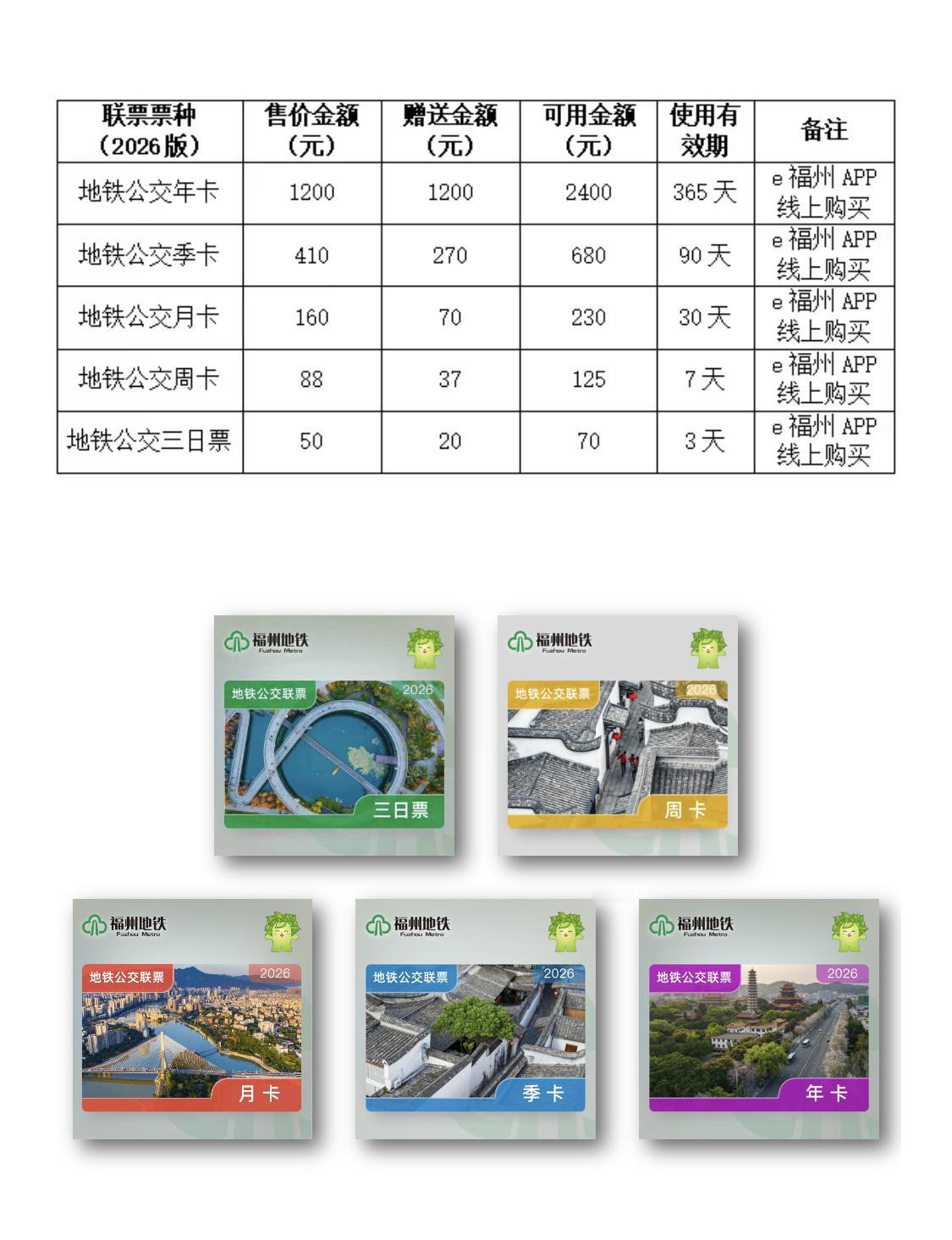 注意啦!福州地铁即将推出全新的地铁公交联票(2026版)并同步上线地铁累积优惠! 2026年1月1日起至2027年12月31日止,地铁公交联票(2026版)以下简称(联票2026版)将全新升级,提供年卡、季卡、月卡、周卡、三日票五种灵活票种,适配不同出行需求。 福州身边事 地铁