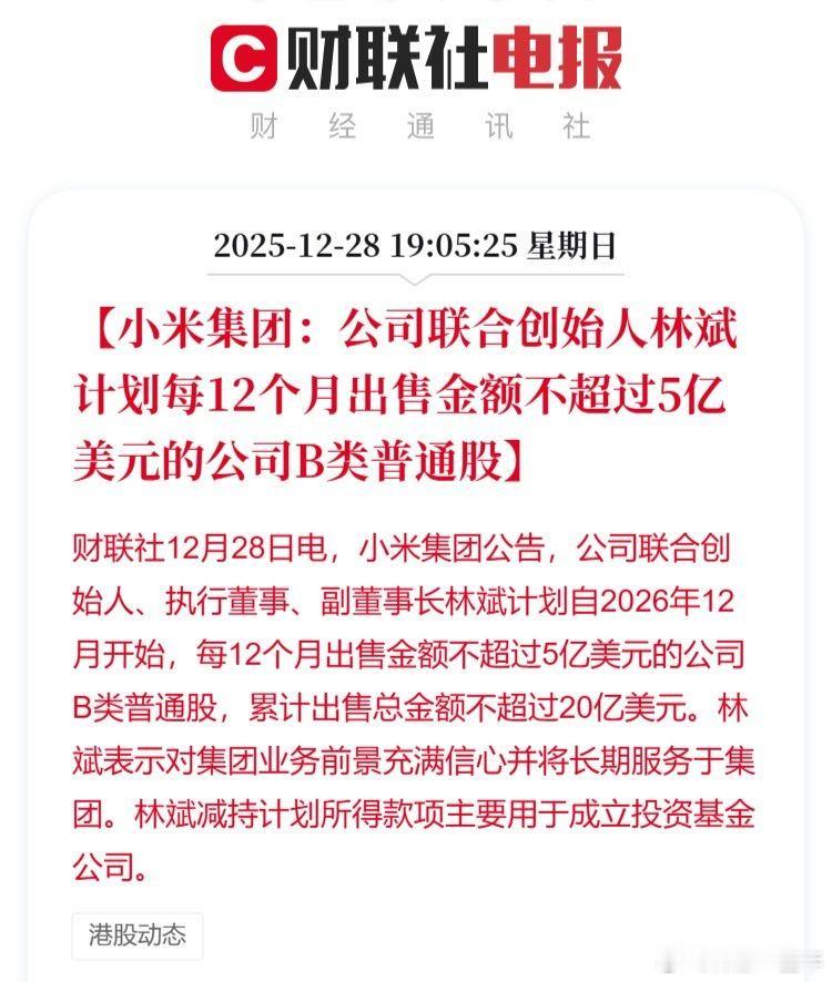 小米集团二把手计划减持5亿美元自2026年12月开始,每12个月出售金额不超过