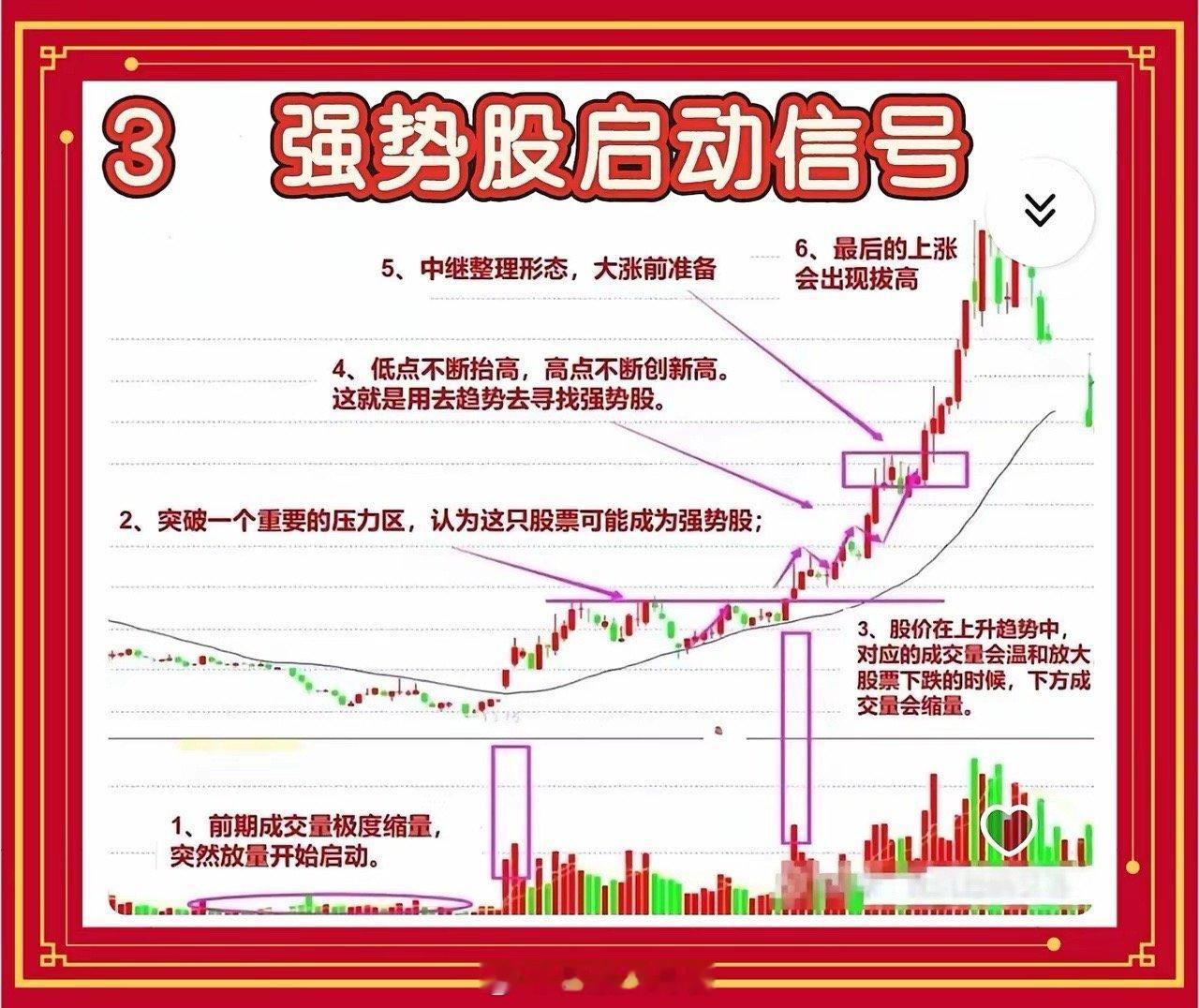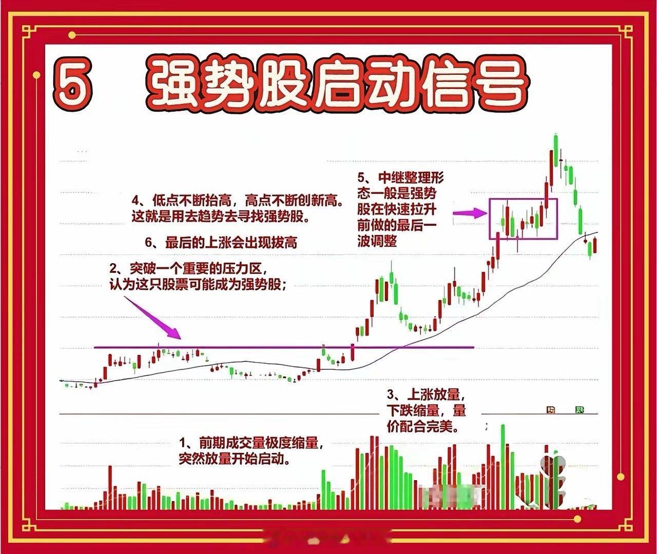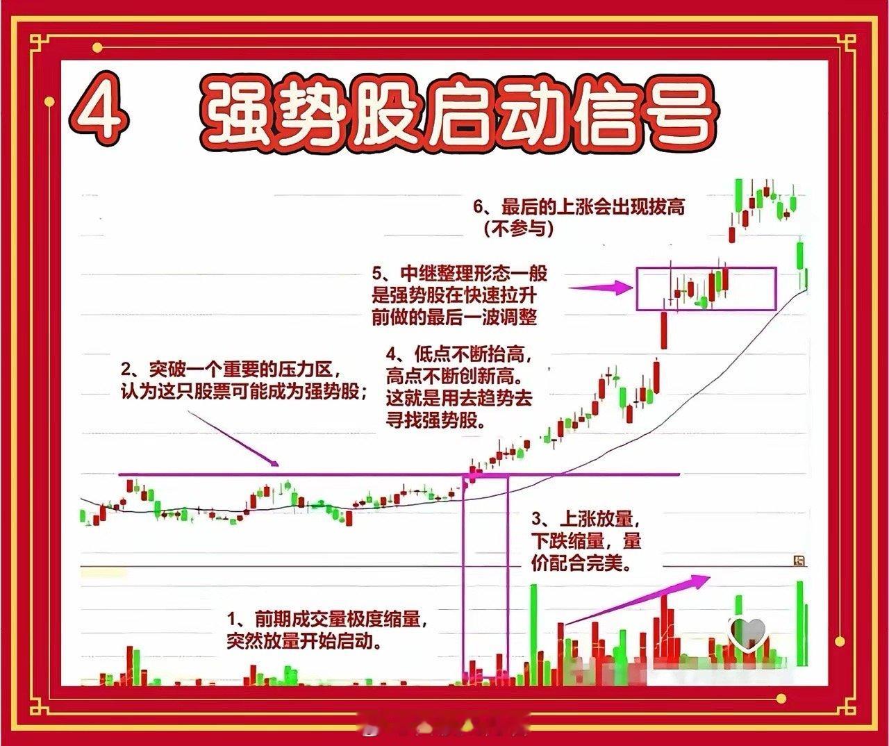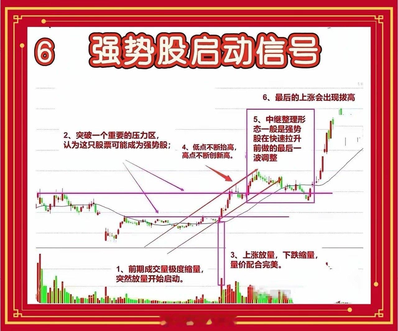 强势股启动信号:提前布局,避开追高陷阱在股市中捕捉强势股的启动节点,关键在于提前识别信号而非追涨杀跌。以下六大特征可作为参考:1. 缩量沉淀后突放巨量长期成交低迷,筹码锁定度高,某一日突然放量突破整理区间,量能较前期放大3倍以上,股价同步上攻,往往是主力启动的明确信号,此时筹码沉淀后的爆发力值得关注。2. 关键位放量站稳在平台高点、前期颈线或历史阻力位,以放量阳线(换手率较均量翻倍)一举突破,且后续3个交易日未回踩破位,说明套牢盘抛压已消化,上行空间打开。3. 阶梯式抬升形态回调低点一次比一次高,反弹高点不断刷新,形成清晰的上升通道。每次回调幅度小于前次上涨幅度,量能在回调时明显萎缩,显示多头主导格局。4. 量价良性配合上涨时成交量温和递增(阳线量能是阴线的1.5倍以上),回调时迅速缩量(阴线量能降至5日均量的50%以下),说明买盘积极而抛压有限,主力控盘度较高。5. 短期整理后长阳突破拉升前出现三角形、旗形等中继形态,震荡时间不超过15个交易日,振幅逐渐收窄(最后5个交易日振幅小于10%),随后一根涨幅超5%的长阳打破平衡,标志整理结束。6. 警惕末端加速信号当股价连续3日以上出现7%以上的大阳线,分时图呈90度陡峭上行,量能单日暴增到前期均量的5倍以上,往往是短期见顶前兆,此时需忍住追涨冲动。操作建议:• 跟踪标的控制在3-5只,避免精力分散;• 每只标的预设止损位(如突破位下方3%或10日均线),破位立即离场;• 优先选择上述信号叠加2-3个的标的,提高胜率。本文仅为技术形态分析,不构成投资建议。股市波动剧烈,决策需结合自身风险承受能力。