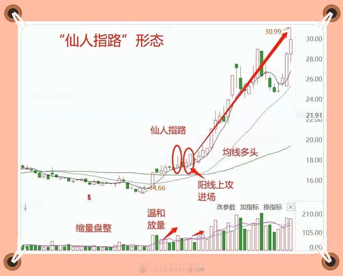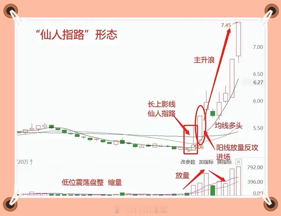 主力洗盘还是出货?看懂“仙人指路”形态就够了很多投资者难以区分主力洗盘与出货,看到个股拉出长上影线,便认定是主力离场出货,实则这种形态往往是主力的试盘手法——仙人指路。主力通过长上影线试探上方抛压,待摸清阻力后再发起攻势,推动股价进入主升行情,精准捕捉该形态便能把握稳健收益。判断一根长上影线是否为有效的“仙人指路”,需满足以下5个条件:1. 股价位置:处于上涨初期或上涨中期,此阶段主力试盘意图明确,而非高位出货。2. K线形态:拉出一根长上影线,K线实体极小,阳线、阴线均可。3. 趋势方向:均线呈多头排列,5日、10日、20日、60日均线自上而下依次排列,形成向上发散的趋势。4. 成交量:量能必须放大,以温和放量为佳,这代表主力控盘力度强,无需付出过高成本即可完成试盘。5. 阳线确认:当后续阳线突破长上影线的高点时,即为主力启动信号,股价大概率将进入主升浪行情。综上,通过股价位置、K线形态、趋势方向、成交量及阳线确认这五大维度,即可辨清主力的真实意图,顺势搭上主力拉升的顺风车。