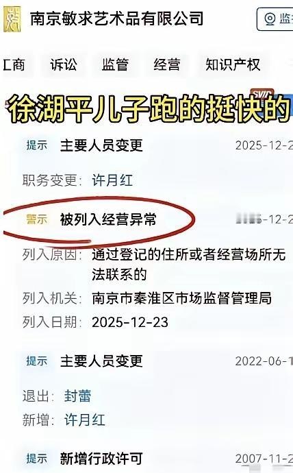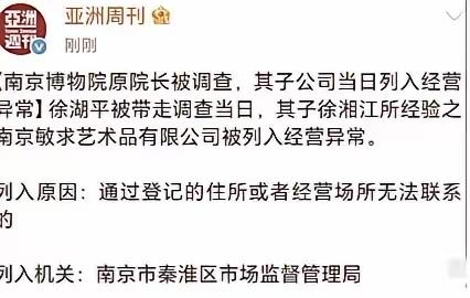 徐湖平儿子跑了? 徐湖平或许早就料到了! 据网上的消息说, 徐湖平被带走调查, 但他儿子却不见了踪影。 这起牵动全国目光的南京博物院文物风波,像一部悬疑剧,正一幕接一幕地揭开。前院长徐湖平被证实已于12月23日被调查组从其南京的别墅中带走,而他儿子徐湘江的“消失”,则让整件事弥漫着更浓的疑云。 父子两人,一前一后,几乎同步“失联”。这绝非巧合能够解释。就在徐湖平被带走前后,他儿子徐湘江名下的“南京火凤凰商业管理有限公司”和“敏求艺术品公司”接连被发现已人去楼空,被市场监管部门列为经营异常。更有迹可循的是,其中一家公司的异常状态,早在今年11月就已出现,这种“未卜先知”式的操作,实在令人脊背发凉。 揭开商业版图,一条隐秘的链条浮现出来。徐湘江并非普通的商人,他的生意与他父亲掌管的文博系统盘根错节。他不仅是多家艺术品公司的控制人,还曾担任“江苏爱涛拍卖有限公司”的董事。 而这家拍卖公司的唯一股东,正是徐湖平曾长期担任法定代表人的“江苏省文物总店”。当年那幅被指以赝品名义调拨出去的《江南春》图卷,正是经由文物总店,以6800元的价格卖给了神秘的“顾客”。 风暴中心的《江南春》,价值从6800元飙升至近亿元。这幅由爱国收藏家庞莱臣后人捐给国家的明代名画,在1997年被南博专家鉴定为“伪作”后调拨处理。 戏剧性的是,它在今年突然现身拍卖市场,估价高达8800万元,随后因庞家后人举报而撤拍。一笔操作,让国之重宝险些以废纸价流失,这其中究竟是严重的失职,还是刻意的监守自盗? 更深的瓜,还在工商信息里埋着。网友深挖发现,徐湘江早年成立公司时,曾有一位名叫封蕾的合伙人。 而封蕾的真实身份,是南京博物院文创部的前副主任。文博机构内部的关键人员,与院长儿子早年合伙经商,这层关系让“里应外合”的猜测变得不再空洞。 徐湖平曾对外表示,会在合适时机回应,一切“等上级调查结果”。现在,国家文物局和江苏省组成的联合调查组已经全面进驻。 公众等待的,不仅是一幅画的真相,更是对一条可能存在的文物蛀蚀链条的彻底清算。文博系统的公信力正在经受考验,只有刮骨疗毒,才能守住中华民族的文化根基。 各位读者你们怎么看?欢迎在评论区讨论。