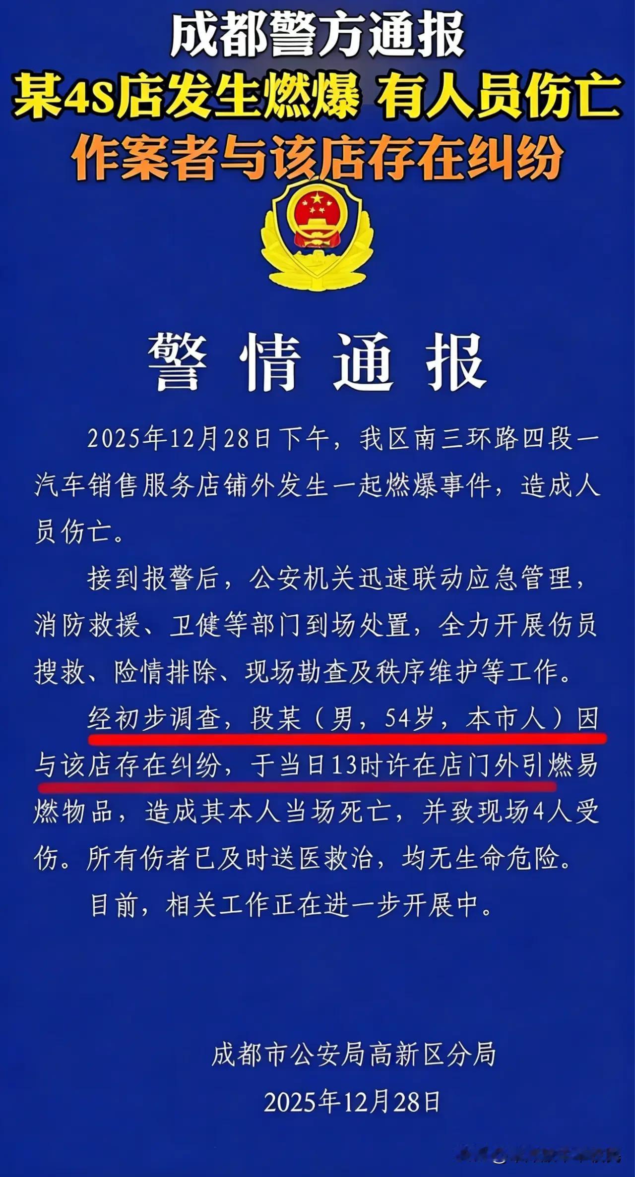 成都4S店爆燃悲剧:1死4伤背后,我们该醒了! 12月28号下午,成都一家4S店外的一声巨响,把所有人都惊懵了——54岁的段某因为和店家闹纠纷,点燃了易燃物,自己当场没了,还连累4个无辜路人受伤。这事儿一出来,没人不唏嘘:多大的坎儿,要走到同归于尽的地步? 先说最扎心的:现在挣钱是真难,可再难也不能拿命赌!段某的纠纷听说是跟“定金”有关,这种事儿不少人都遇过——4S店套路多,合同藏猫腻,真要维权,要么被踢皮球,要么鉴定费比损失还贵。可再委屈,也不能拉着无辜人垫背啊!那4个伤者,可能就是路过买瓶水、上班赶个路,平白遭这罪,换谁能甘心? 更该琢磨的是“退一步”的道理。现在大家日子都紧,心里容易憋火,一点小事就可能炸。要是4S店早点心平气和解决问题,别把人逼到死角;要是段某能想想家里人,别钻牛角尖找别的维权路——打12315、找消协、联系媒体,总有能说理的地方,何至于闹到这步田地? 这事儿不是个案。4S店过度维修、配件以次充好早就不是秘密,监管有时候跟不上,维权难成了通病。但再难,也不能踩“公共安全”的红线!生命就一次,自己的要珍惜,别人的更不能糟践。希望这起悲剧能敲个警钟:商家别店大欺客,遇到事儿多体谅;咱们普通人维权也得理性,别让“讨公道”变成“造悲剧”。